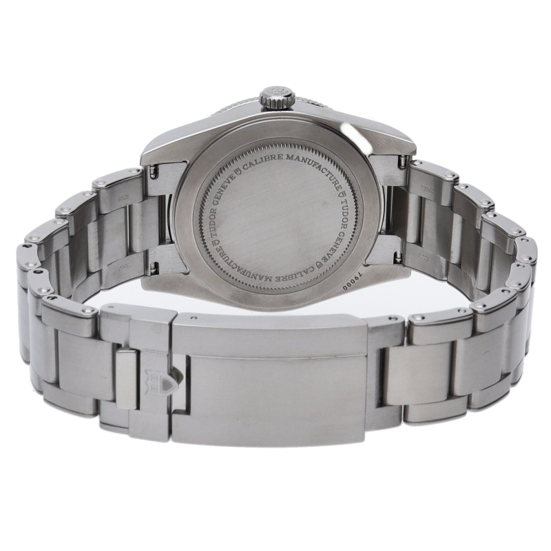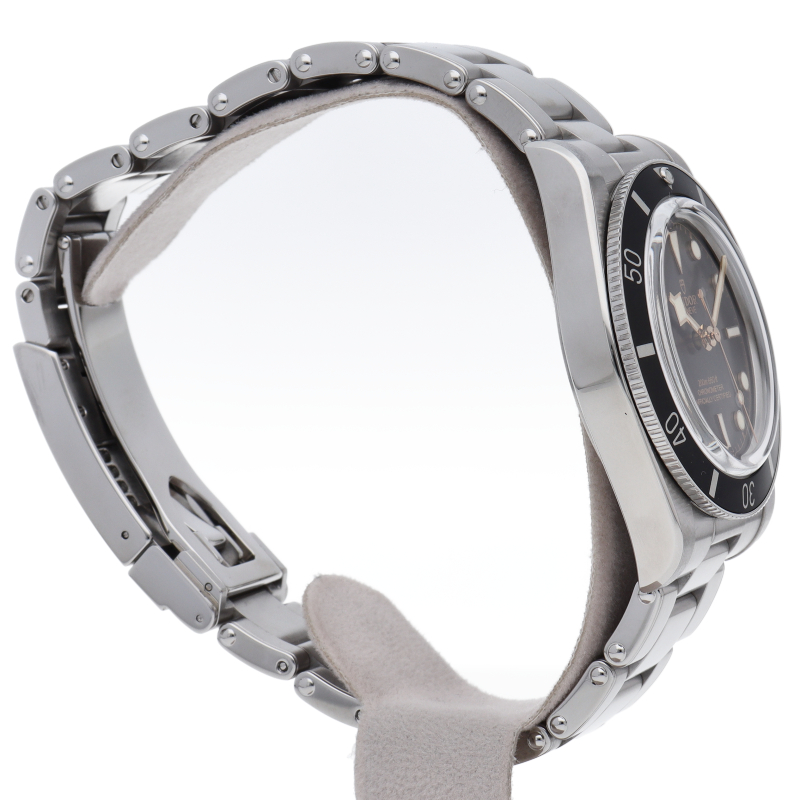 チューダーの初期のサブマリーナに使用されていた通称“イカ針”を採用した「ブラックベイ」。こちらはステンレスタイプで、ケース径37mmモデル。1960年代までのロレックスやチューダーに使われていたリベットブレス仕様のダイバーウォッチです。