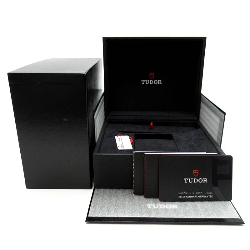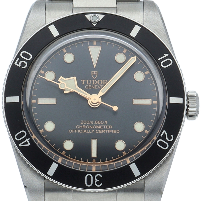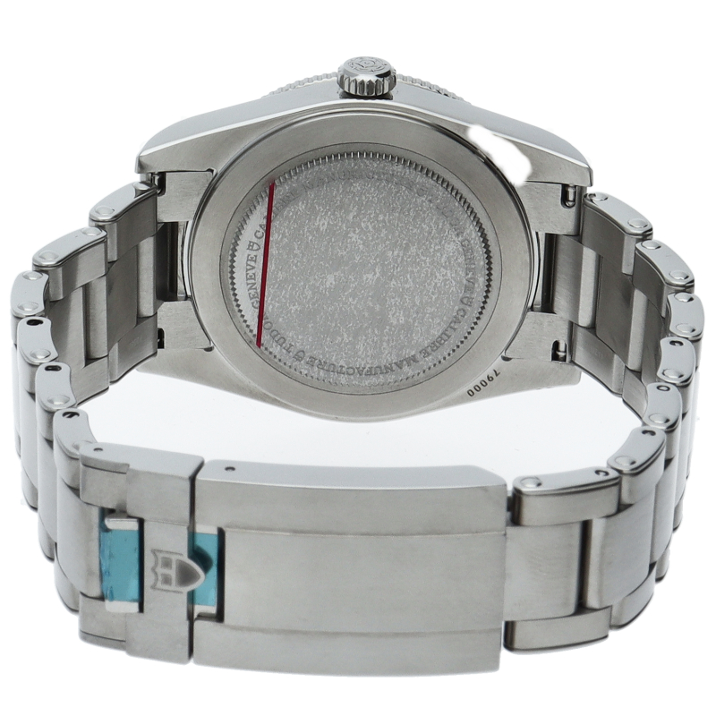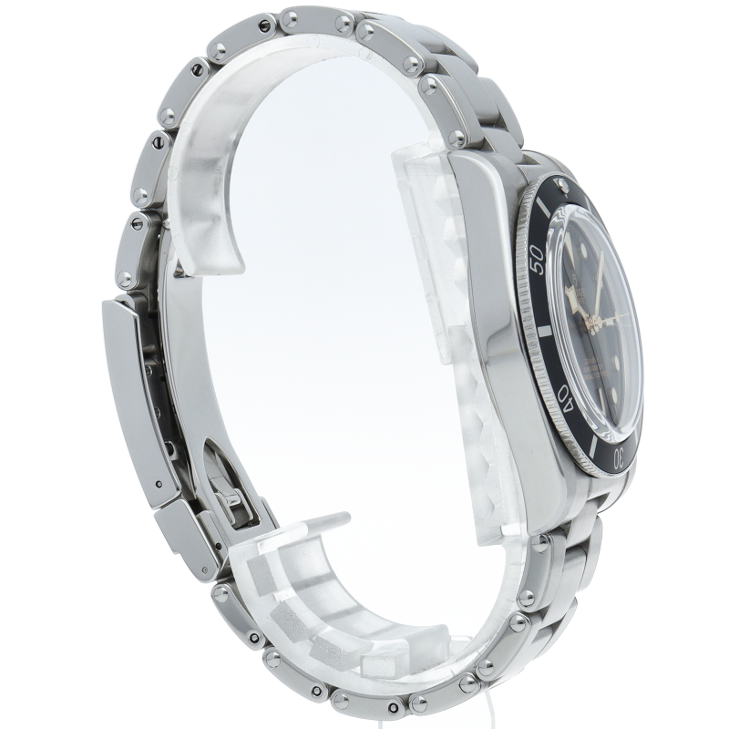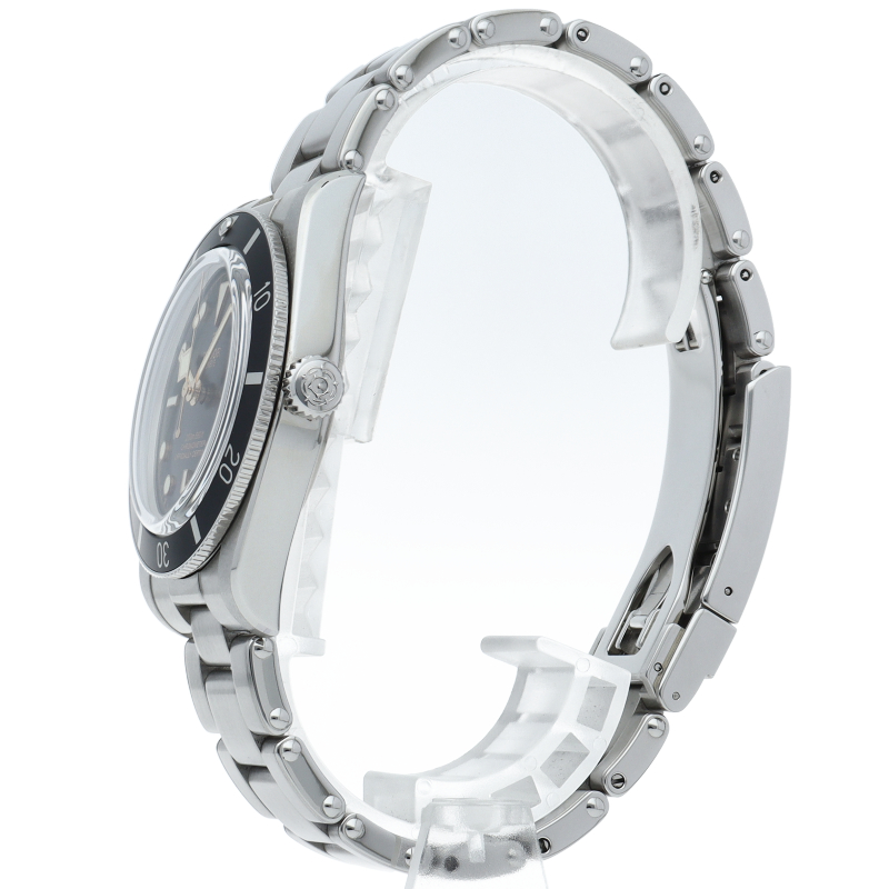 チューダーの初期のサブマリーナに使用されていた通称“イカ針”を採用した「ブラックベイ」。こちらはステンレスタイプで、ケース径37mmモデル。1960年代までのロレックスやチューダーに使われていたリベットブレス仕様のダイバーウォッチです。