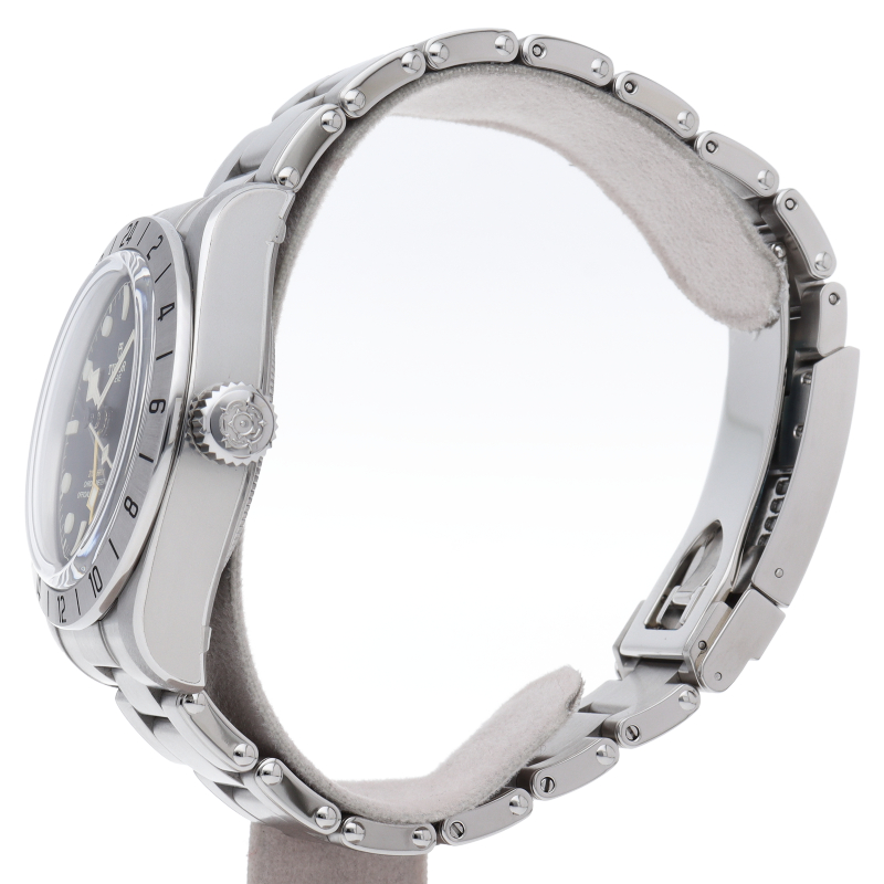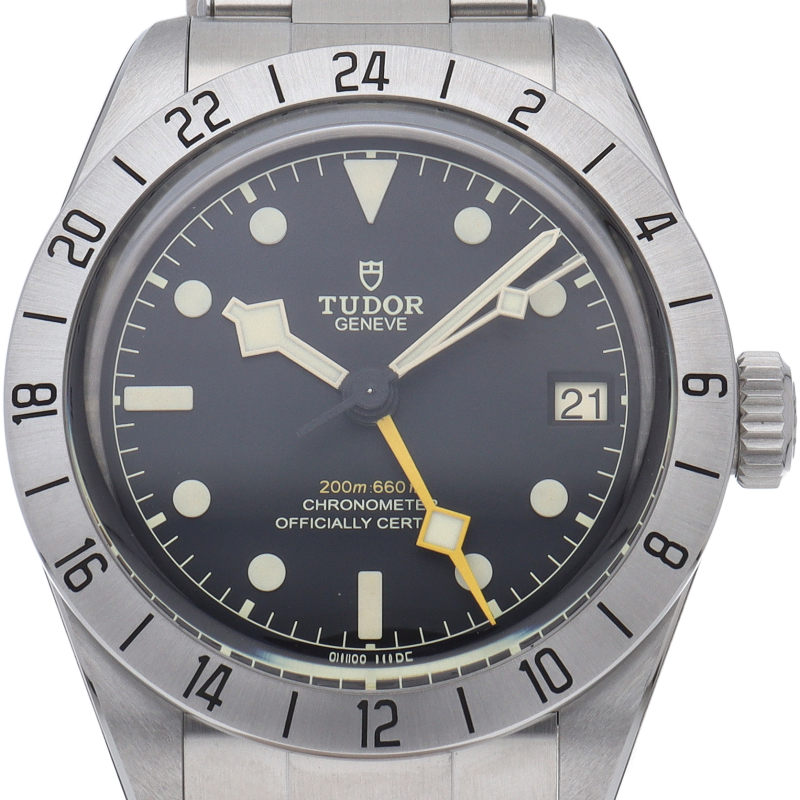 固定式のベゼルに刻印された24時間表示、大きめのイエローの24時間針等、ロレックスの初代エクスプローラー2を彷彿とさせるデザインで話題を呼んだブラックベイプロ。人気機種のフィフティーエイトと同じ39ミリケースを採用しており、日本人の手首周りにも馴染みやすいKサイズ感です。ムーブメントはクロノメーター認定を受け70時間のパワーリザーブを有する、両方向巻上げ式の自社製MT5652を搭載しています。