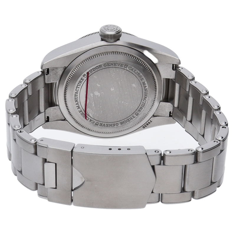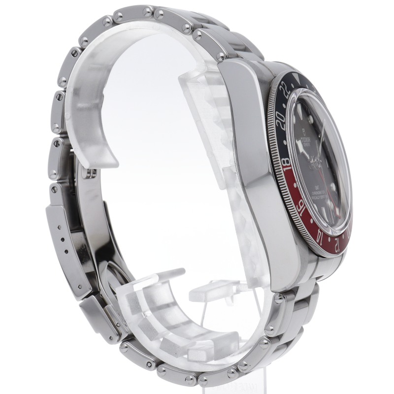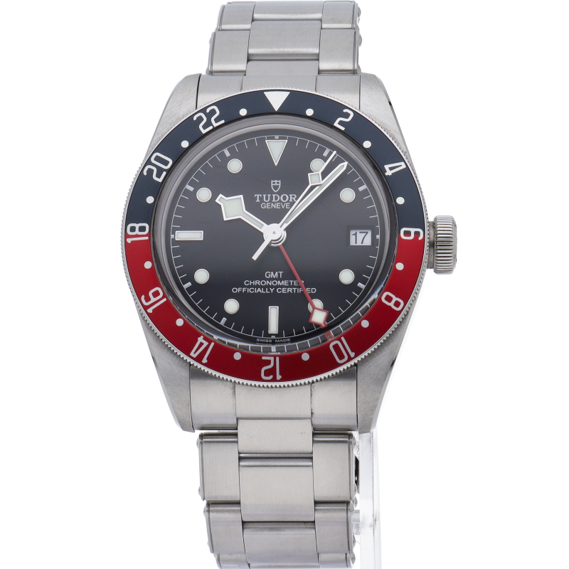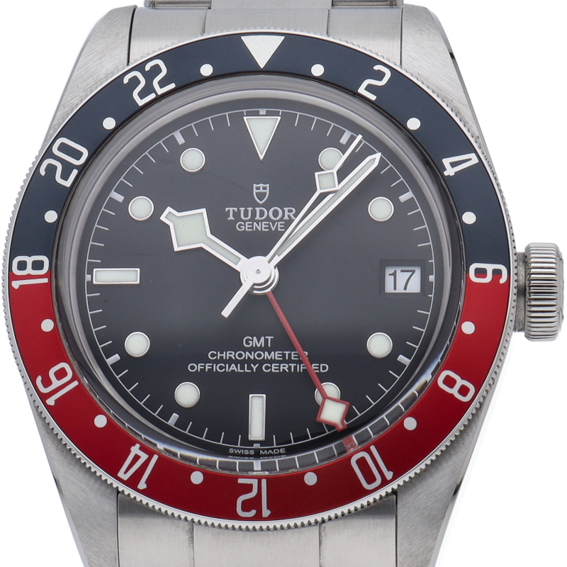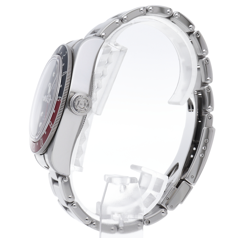 チュードルを代表するスポーツモデル「ブラックベイ」のGMT搭載モデル。ベゼルは昼夜がわかる様「ブルー/レッド」の2トーンの通称ペプシカラーとなっています。過去のダイバーズウォッチからインスピレーションを得た四角い針はGMT針にも付いています。自社製GMTムーブメント「MT5652」を搭載。70時間のパワーリザーブを誇り、クロノメーター認定を受けたムーブメントです。