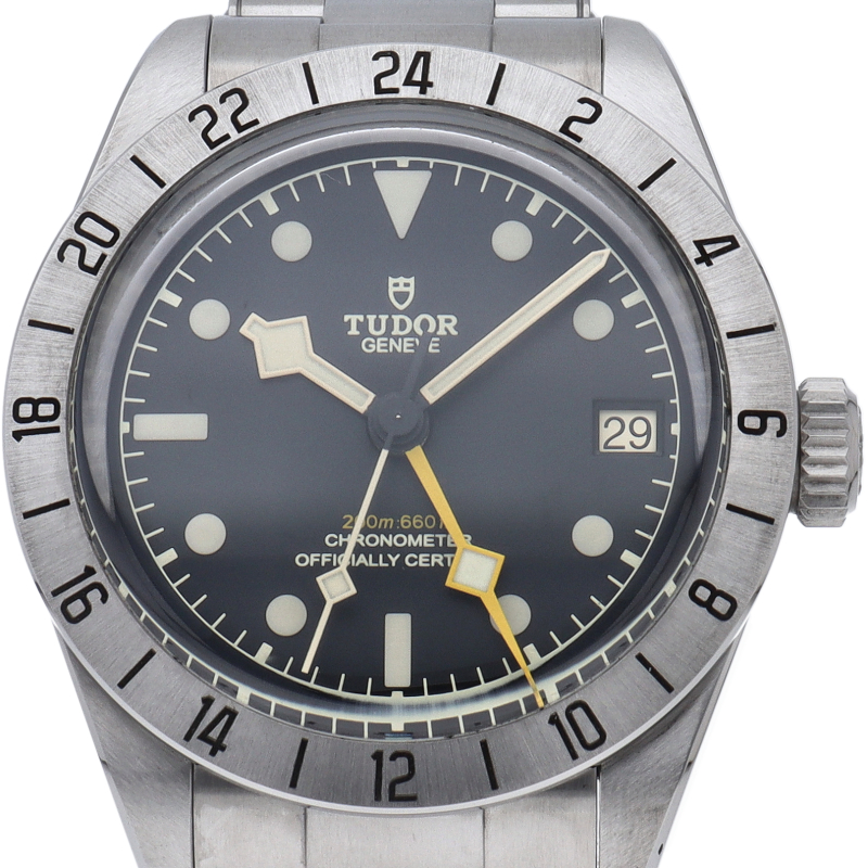 固定式のベゼルに刻印された24時間表示、大きめのイエローの24時間針等、ロレックスの初代エクスプローラー2を彷彿とさせるデザインで話題を呼んだブラックベイプロ。人気機種のフィフティーエイトと同じ39ミリケースを採用しており、日本人の手首周りにも馴染みやすいKサイズ感です。ムーブメントはクロノメーター認定を受け70時間のパワーリザーブを有する、両方向巻上げ式の自社製MT5652を搭載しています。