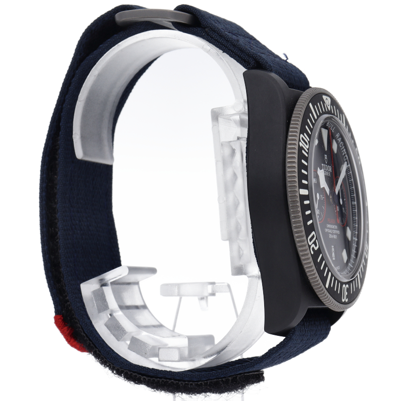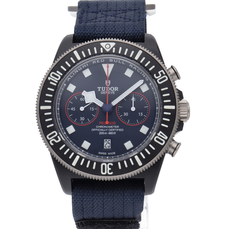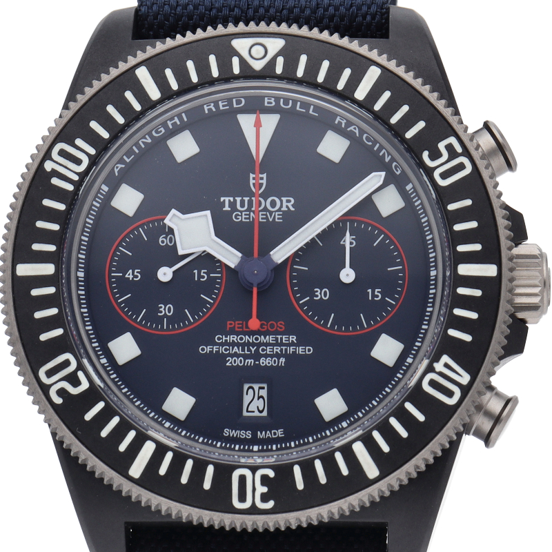 チューダーの話題作「ぺラゴス」。こちらは競技ヨットレースのために設計されたクロノグラフのモデルです。素材にカーボンコンポジットを使いペラゴス初のクロノグラフ機能を搭載したモデル。アリンギ・レッドブル・レーシングとのパートナーシップを記念した、モデルとなります。