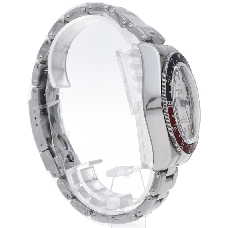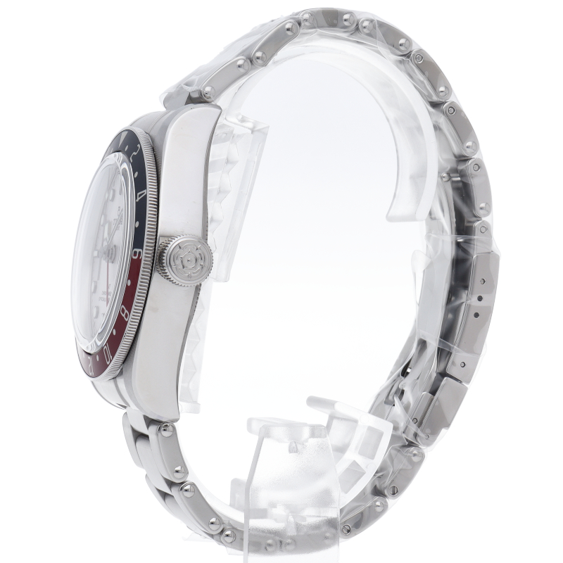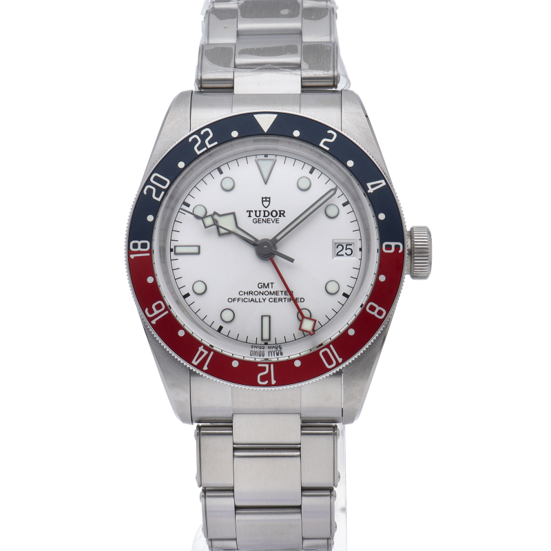 チュードルを代表するスポーツモデル「ブラックベイ」のGMT搭載モデル。ベゼルは昼夜がわかる様「ブルー/レッド」の2トーンの通称ペプシカラーとなっています。過去のダイバーズウォッチからインスピレーションを得た四角い針はGMT針にも付いています。自社製GMTムーブメント「MT5652」を搭載。70時間のパワーリザーブを誇り、クロノメーター認定を受けたムーブメントです。