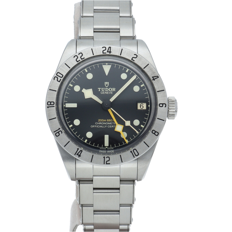 固定式のベゼルに刻印された24時間表示、大きめのイエローの24時間針等、ロレックスの初代エクスプローラー2を彷彿とさせるデザインで話題を呼んだブラックベイプロ。人気機種のフィフティーエイトと同じ39ミリケースを採用しており、日本人の手首周りにも馴染みやすいKサイズ感です。ムーブメントはクロノメーター認定を受け70時間のパワーリザーブを有する、両方向巻上げ式の自社製MT5652を搭載しています。