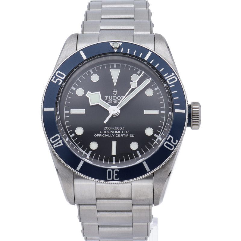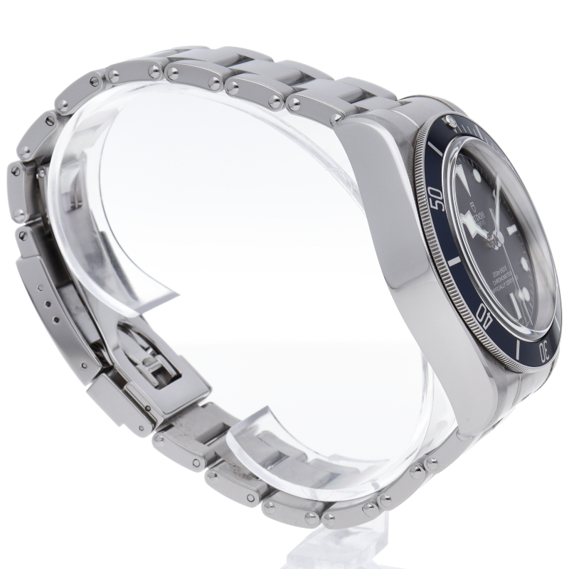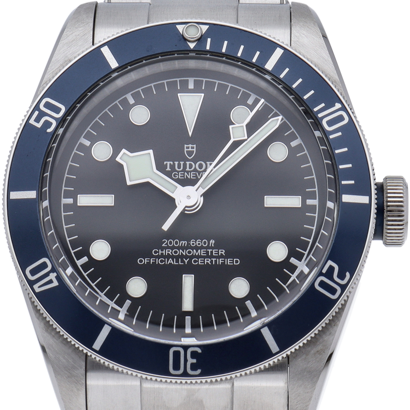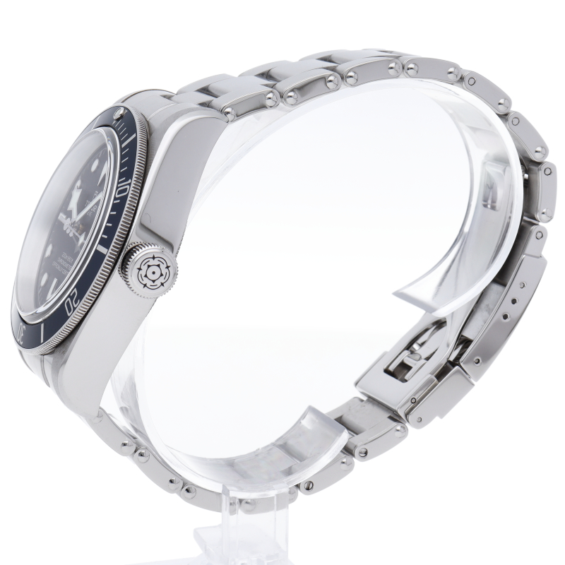 チューダーの初期のサブマリーナに使用されていた通称“イカ針”を採用した「ブラックベイ」2016年発表のニューモデルです。ダイヤルには現行タイプの「盾」マークがプリントされていますが、リューズトップにはヴィンテージ感の漂う「バラ」マークを刻印。ムーブメントにはCOSC公認のクロノメーターを取得した70時間パワーリザーブの自社製キャリバー「MT5602」を搭載。