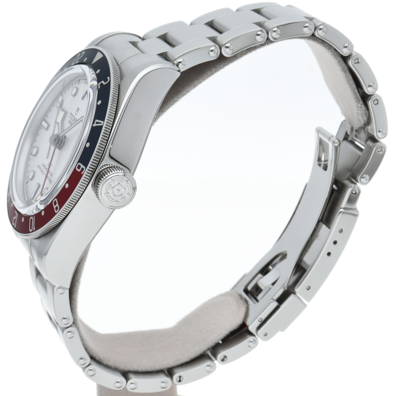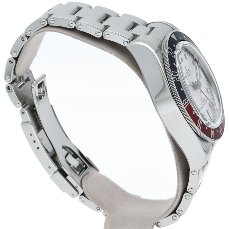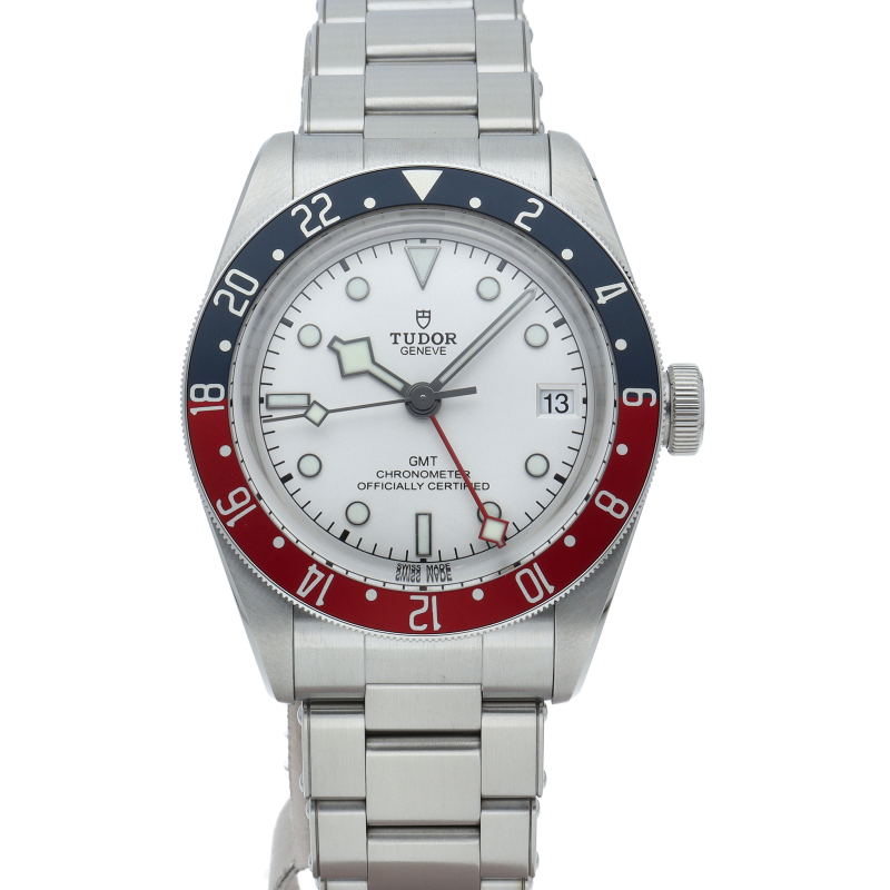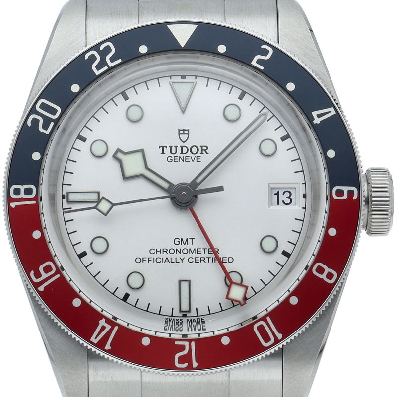 チュードルを代表するスポーツモデル「ブラックベイ」のGMT搭載モデル。ベゼルは昼夜がわかる様「ブルー/レッド」の2トーンの通称ペプシカラーとなっています。過去のダイバーズウォッチからインスピレーションを得た四角い針はGMT針にも付いています。自社製GMTムーブメント「MT5652」を搭載。70時間のパワーリザーブを誇り、クロノメーター認定を受けたムーブメントです。
