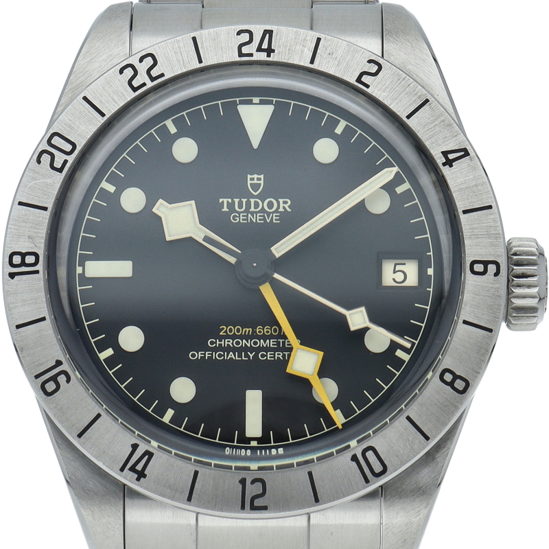 固定式のベゼルに刻印された24時間表示、大きめのイエローの24時間針等、ロレックスの初代エクスプローラー2を彷彿とさせるデザインで話題を呼んだブラックベイプロ。人気機種のフィフティーエイトと同じ39ミリケースを採用しており、日本人の手首周りにも馴染みやすいKサイズ感です。ムーブメントはクロノメーター認定を受け70時間のパワーリザーブを有する、両方向巻上げ式の自社製MT5652を搭載しています。