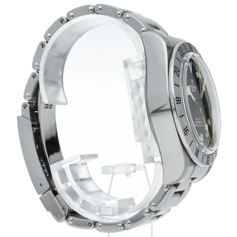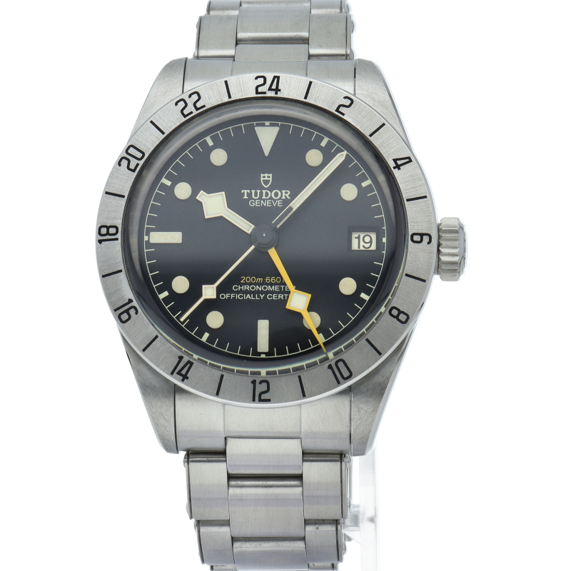 固定式のベゼルに刻印された24時間表示、大きめのイエローの24時間針等、ロレックスの初代エクスプローラー2を彷彿とさせるデザインで話題を呼んだブラックベイプロ。人気機種のフィフティーエイトと同じ39ミリケースを採用しており、日本人の手首周りにも馴染みやすいKサイズ感です。ムーブメントはクロノメーター認定を受け70時間のパワーリザーブを有する、両方向巻上げ式の自社製MT5652を搭載しています。