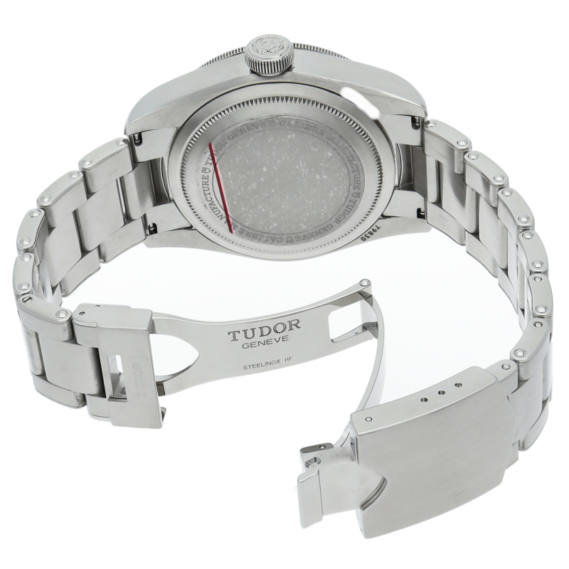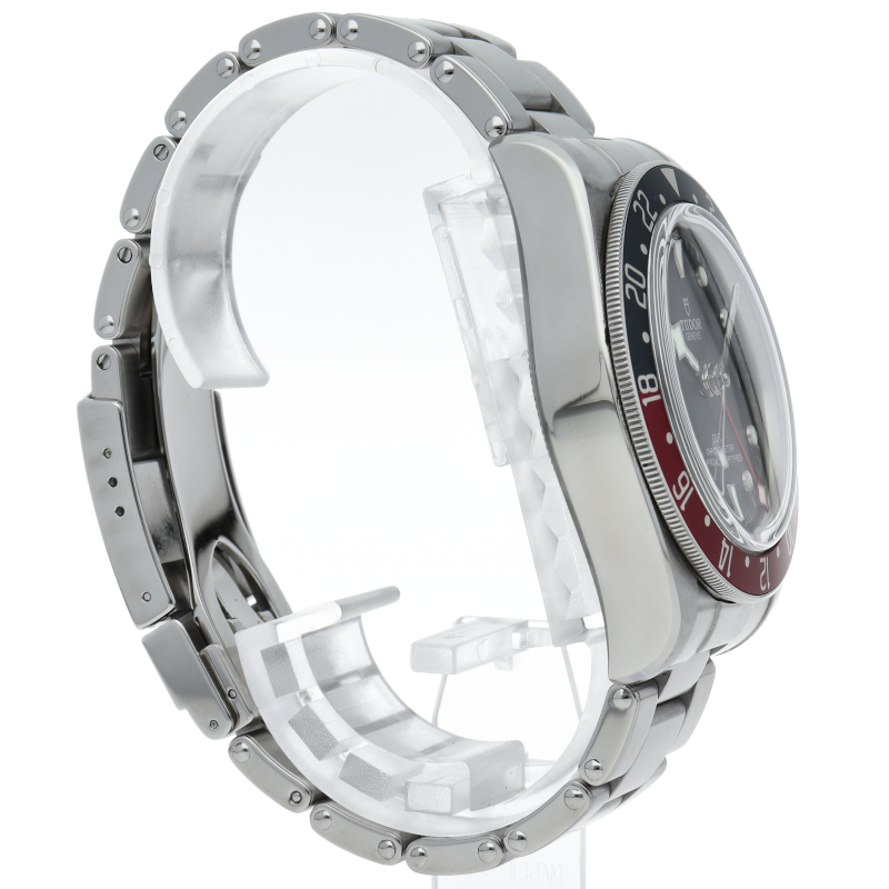 チュードルを代表するスポーツモデル「ブラックベイ」のGMT搭載モデル。ベゼルは昼夜がわかる様「ブルー/レッド」の2トーンの通称ペプシカラーとなっています。過去のダイバーズウォッチからインスピレーションを得た四角い針はGMT針にも付いています。自社製GMTムーブメント「MT5652」を搭載。70時間のパワーリザーブを誇り、クロノメーター認定を受けたムーブメントです。
