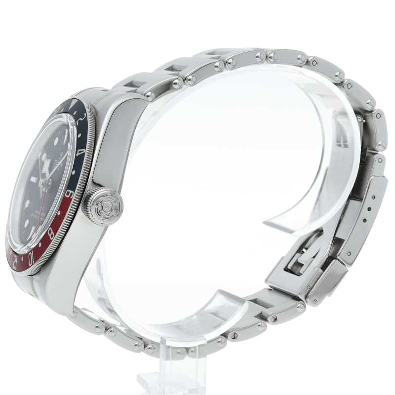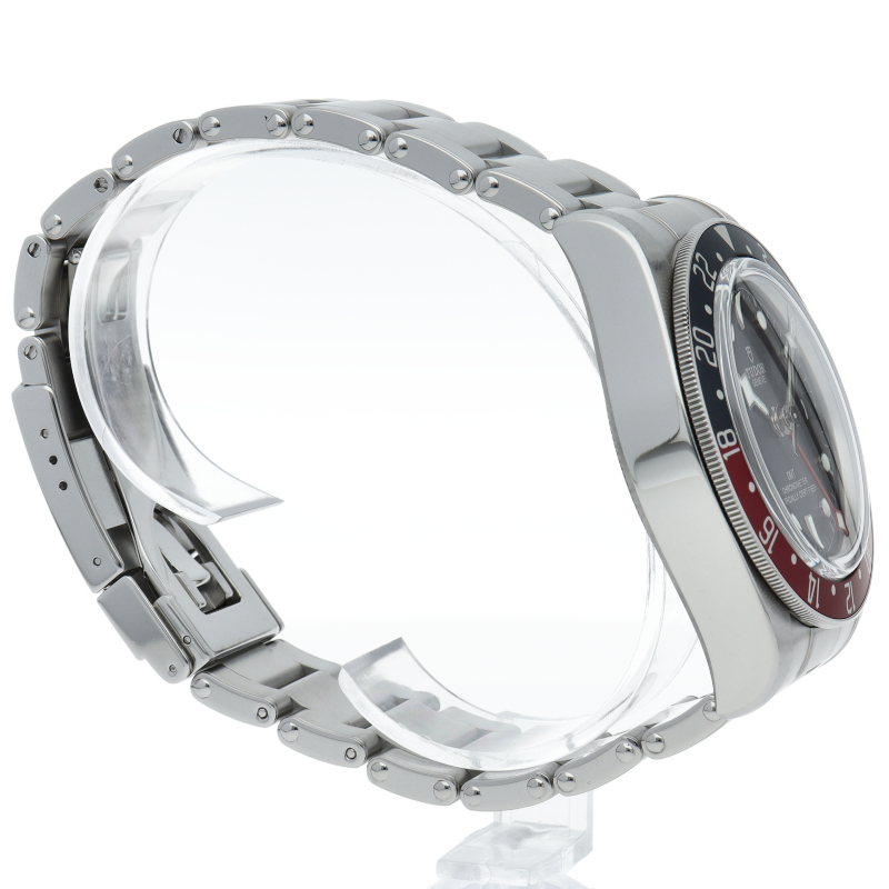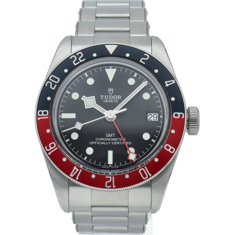 チュードルを代表するスポーツモデル「ブラックベイ」のGMT搭載モデル。ベゼルは昼夜がわかる様「ブルー/レッド」の2トーンの通称ペプシカラーとなっています。過去のダイバーズウォッチからインスピレーションを得た四角い針はGMT針にも付いています。自社製GMTムーブメント「MT5652」を搭載。70時間のパワーリザーブを誇り、クロノメーター認定を受けたムーブメントです。