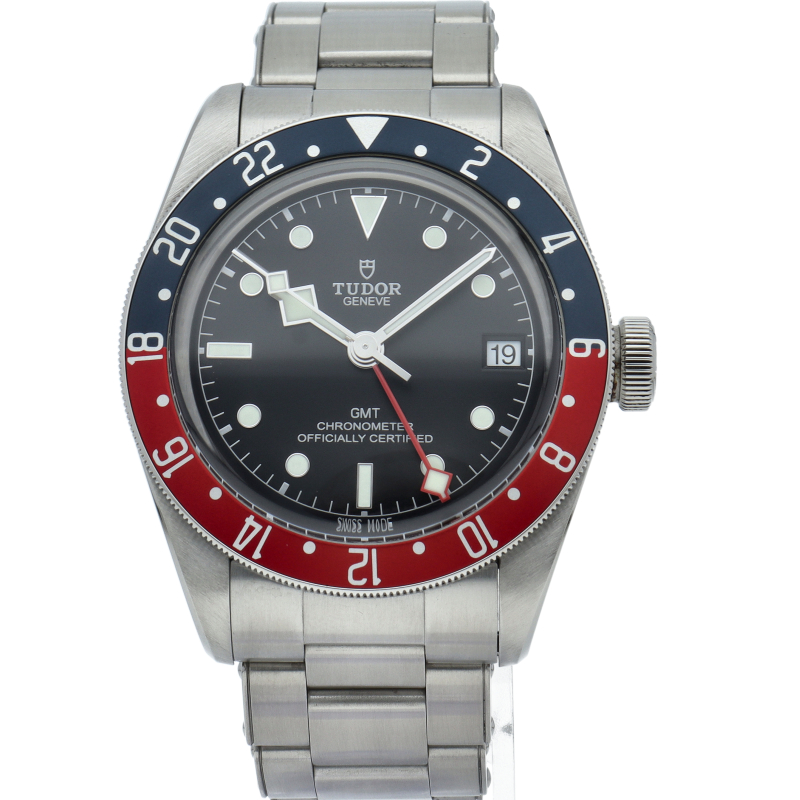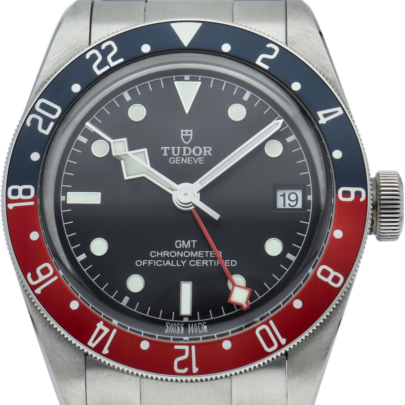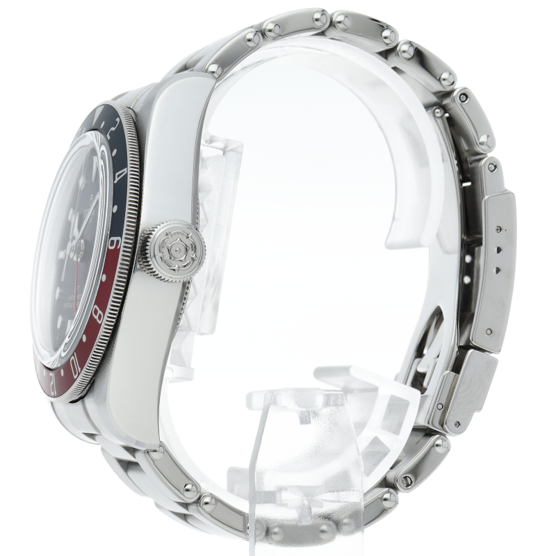 チュードルを代表するスポーツモデル「ブラックベイ」のGMT搭載モデル。ベゼルは昼夜がわかる様「ブルー/レッド」の2トーンの通称ペプシカラーとなっています。過去のダイバーズウォッチからインスピレーションを得た四角い針はGMT針にも付いています。自社製GMTムーブメント「MT5652」を搭載。70時間のパワーリザーブを誇り、クロノメーター認定を受けたムーブメントです。
