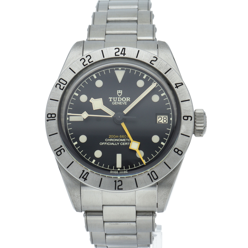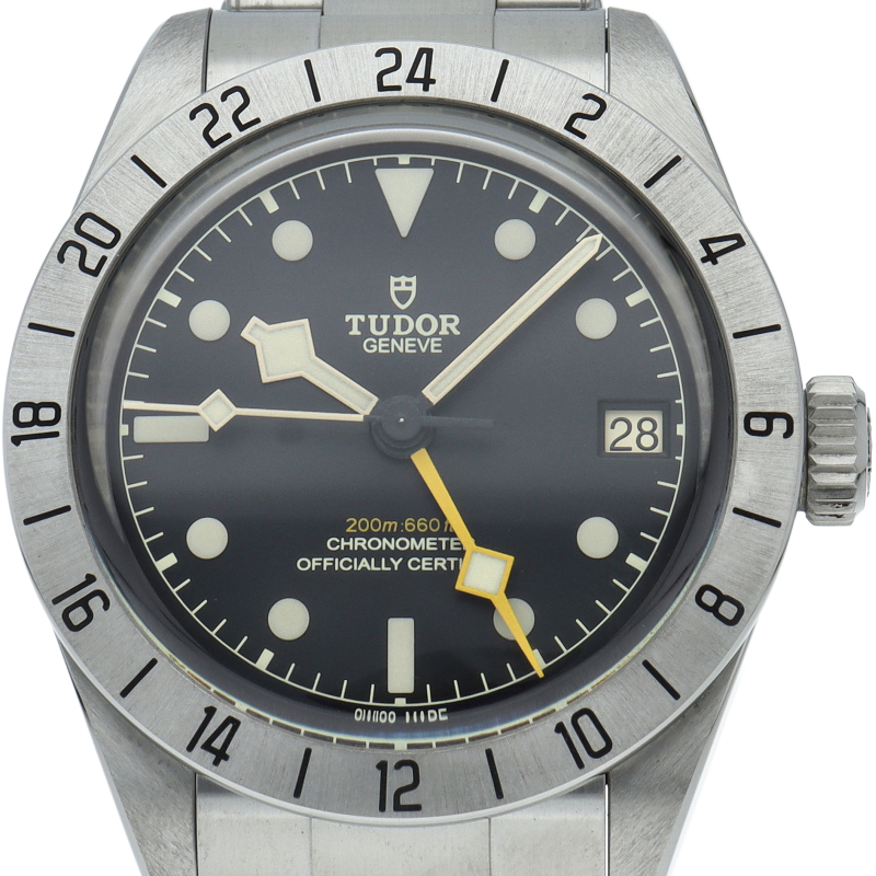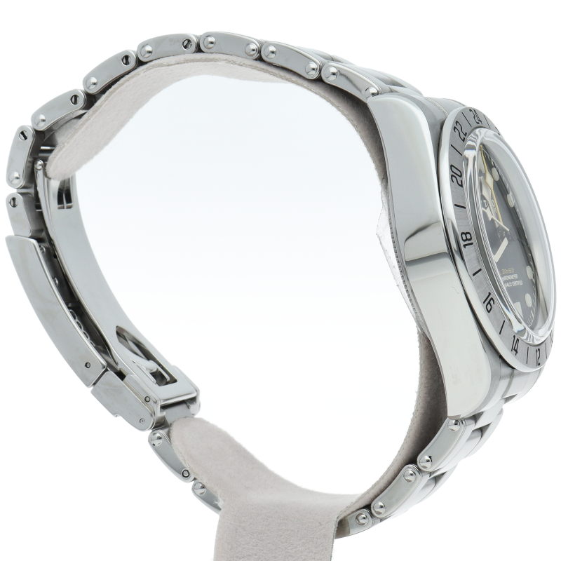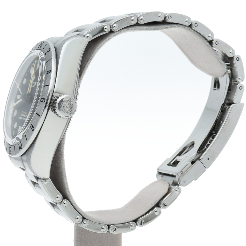 固定式のベゼルに刻印された24時間表示、大きめのイエローの24時間針等、ロレックスの初代エクスプローラー2を彷彿とさせるデザインで話題を呼んだブラックベイプロ。人気機種のフィフティーエイトと同じ39ミリケースを採用しており、日本人の手首周りにも馴染みやすいKサイズ感です。ムーブメントはクロノメーター認定を受け70時間のパワーリザーブを有する、両方向巻上げ式の自社製MT5652を搭載しています。