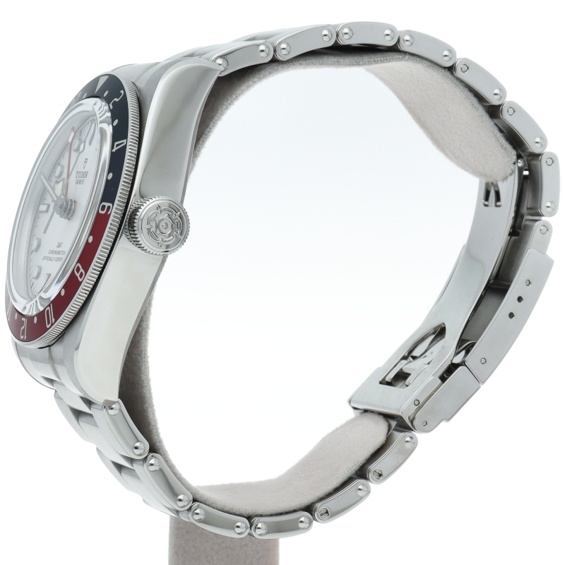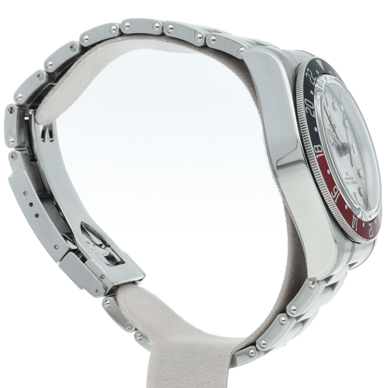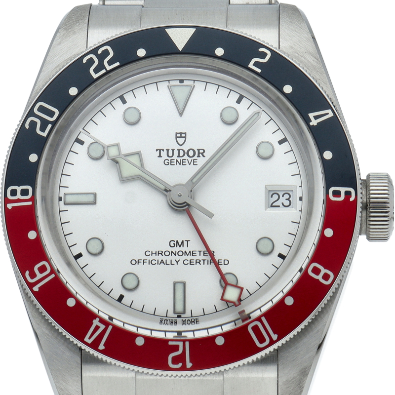 チュードルを代表するスポーツモデル「ブラックベイ」のGMT搭載モデル。ベゼルは昼夜がわかる様「ブルー/レッド」の2トーンの通称ペプシカラーとなっています。過去のダイバーズウォッチからインスピレーションを得た四角い針はGMT針にも付いています。自社製GMTムーブメント「MT5652」を搭載。70時間のパワーリザーブを誇り、クロノメーター認定を受けたムーブメントです。