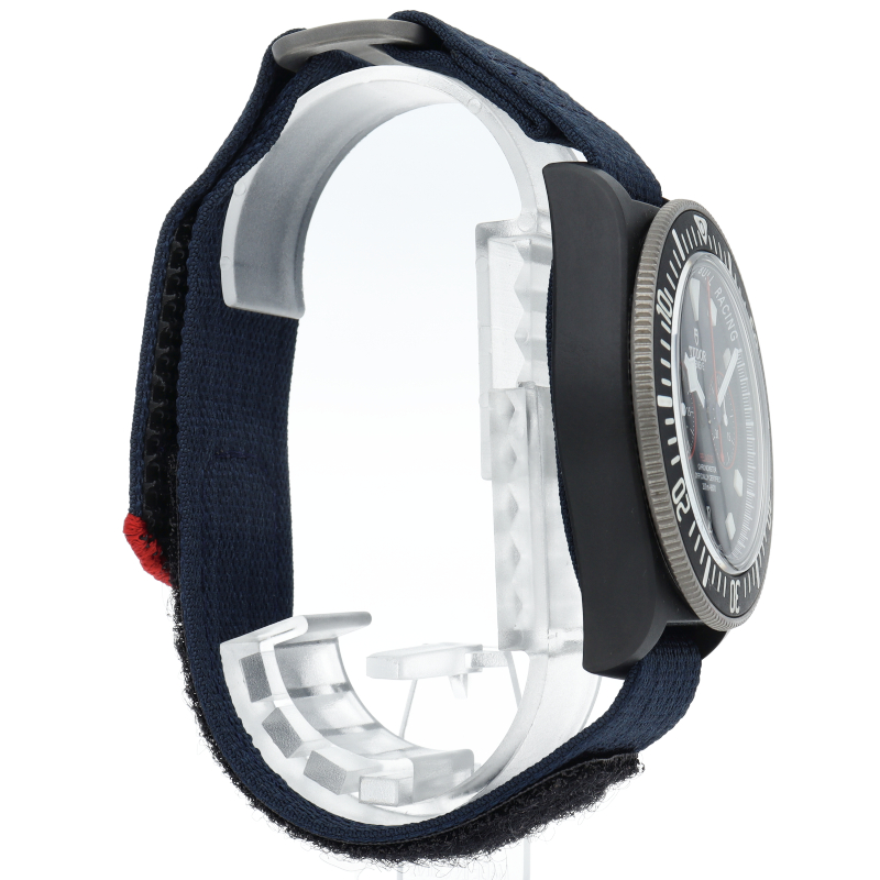 チューダーの話題作「ぺラゴス」。こちらは競技ヨットレースのために設計されたクロノグラフのモデルです。素材にカーボンコンポジットを使いペラゴス初のクロノグラフ機能を搭載したモデル。アリンギ・レッドブル・レーシングとのパートナーシップを記念した、モデルとなります。