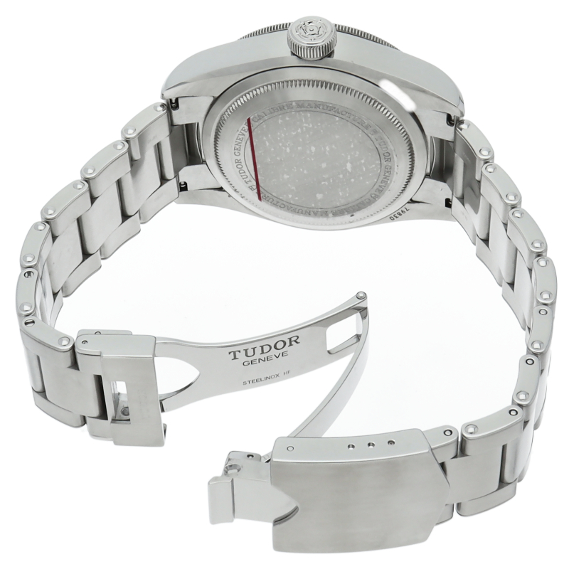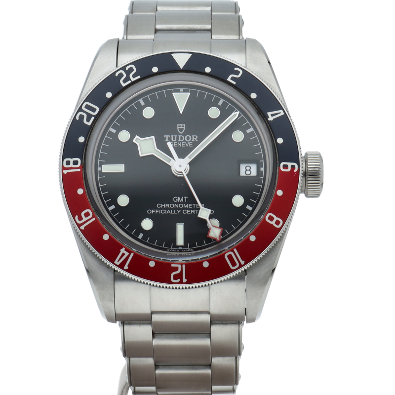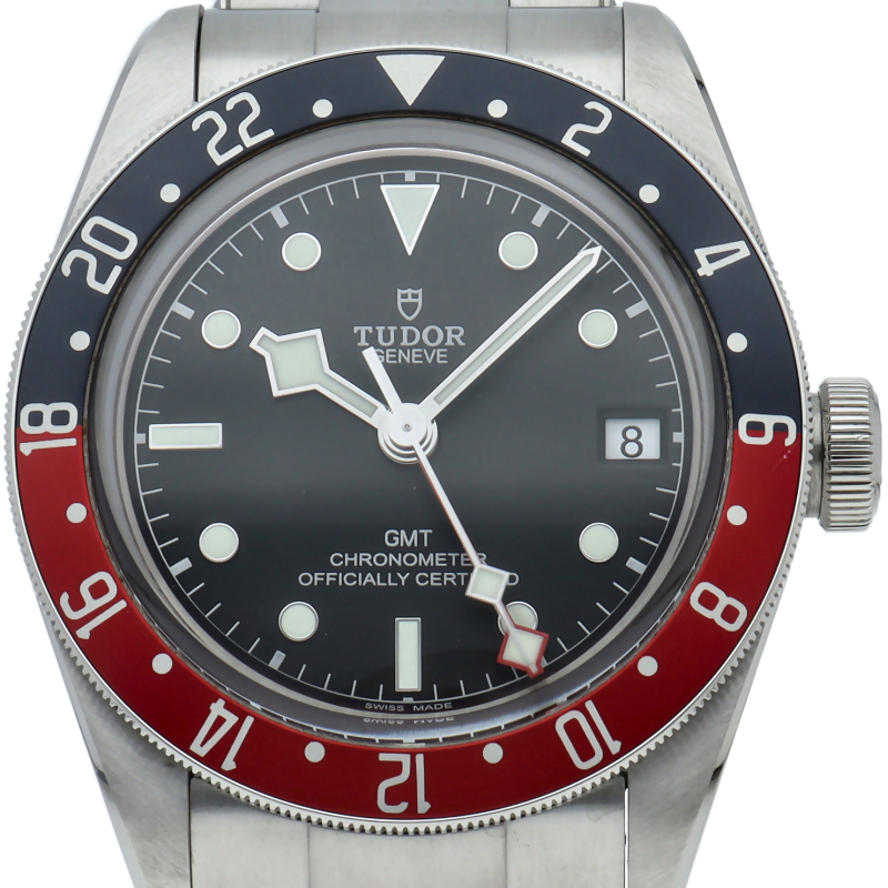 チュードルを代表するスポーツモデル「ブラックベイ」のGMT搭載モデル。ベゼルは昼夜がわかる様「ブルー/レッド」の2トーンの通称ペプシカラーとなっています。過去のダイバーズウォッチからインスピレーションを得た四角い針はGMT針にも付いています。自社製GMTムーブメント「MT5652」を搭載。70時間のパワーリザーブを誇り、クロノメーター認定を受けたムーブメントです。