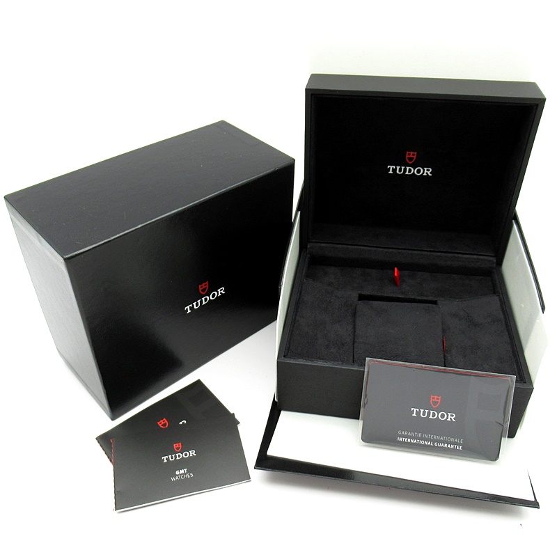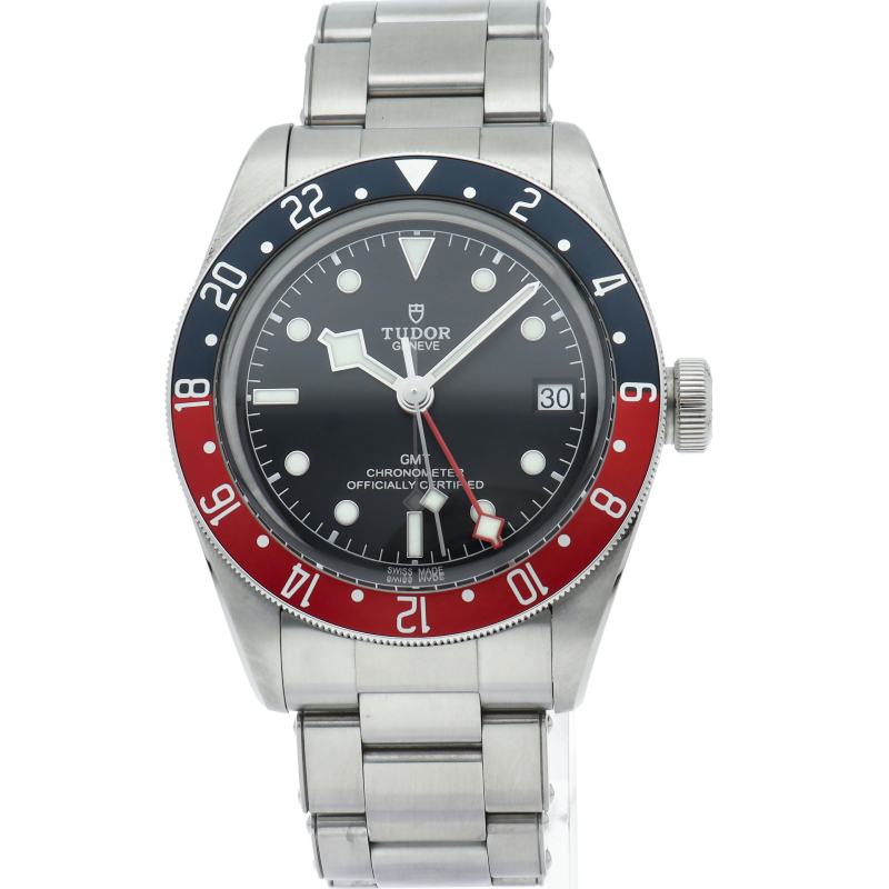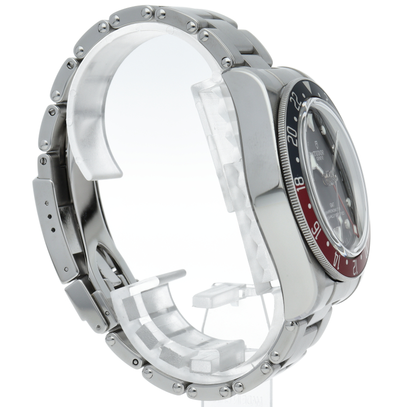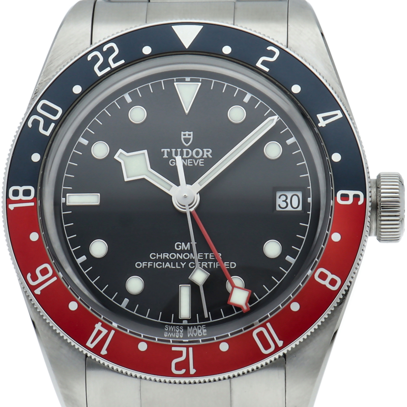 チュードルを代表するスポーツモデル「ブラックベイ」のGMT搭載モデル。ベゼルは昼夜がわかる様「ブルー/レッド」の2トーンの通称ペプシカラーとなっています。過去のダイバーズウォッチからインスピレーションを得た四角い針はGMT針にも付いています。自社製GMTムーブメント「MT5652」を搭載。70時間のパワーリザーブを誇り、クロノメーター認定を受けたムーブメントです。