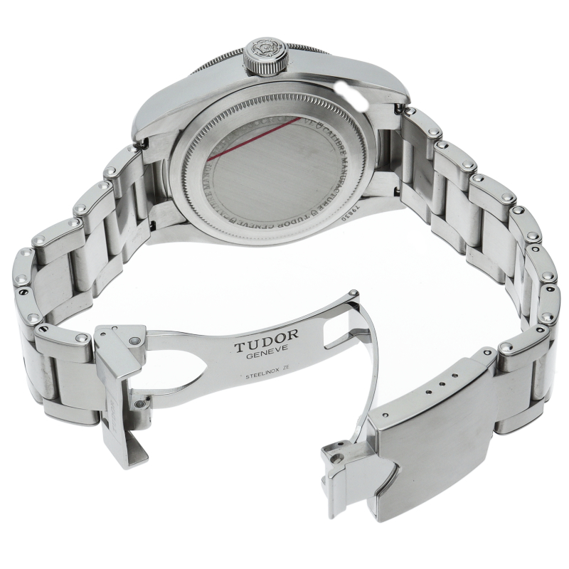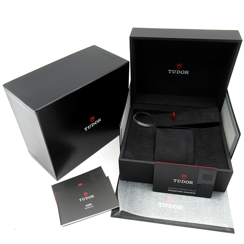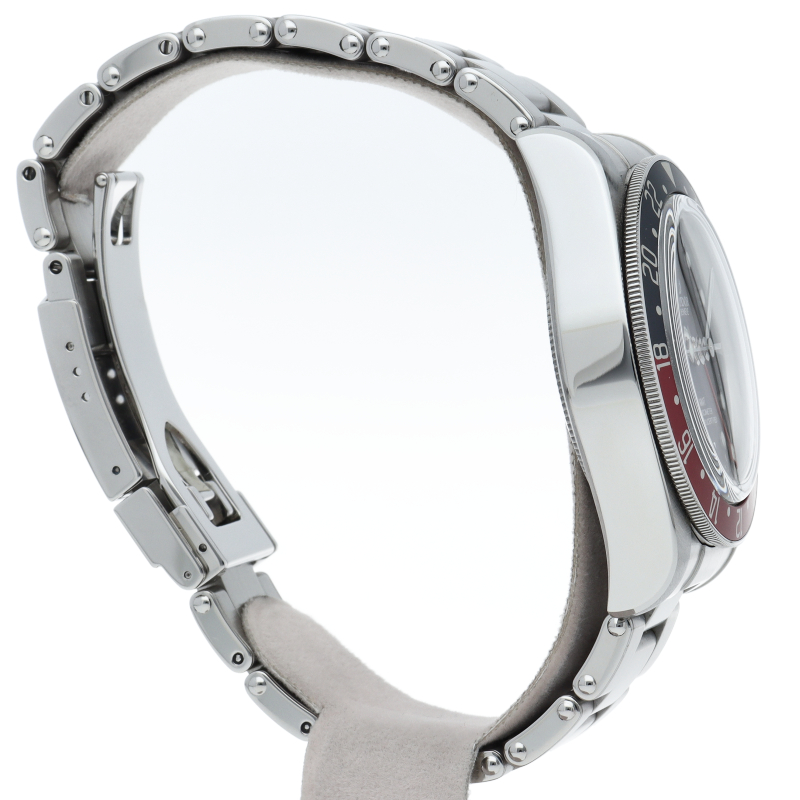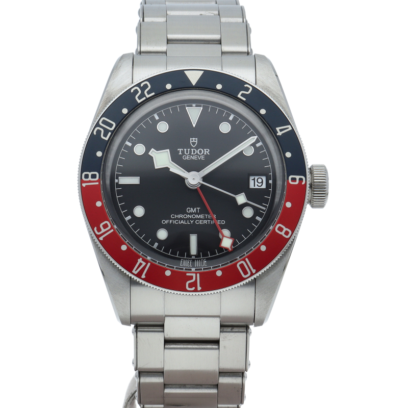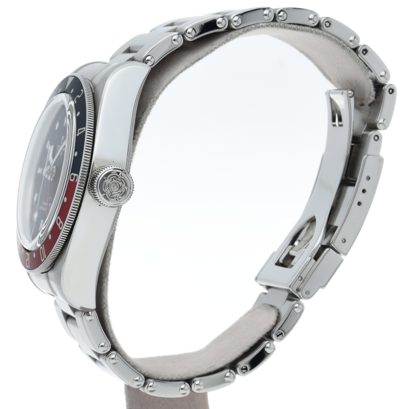 チュードルを代表するスポーツモデル「ブラックベイ」のGMT搭載モデル。ベゼルは昼夜がわかる様「ブルー/レッド」の2トーンの通称ペプシカラーとなっています。過去のダイバーズウォッチからインスピレーションを得た四角い針はGMT針にも付いています。自社製GMTムーブメント「MT5652」を搭載。70時間のパワーリザーブを誇り、クロノメーター認定を受けたムーブメントです。
