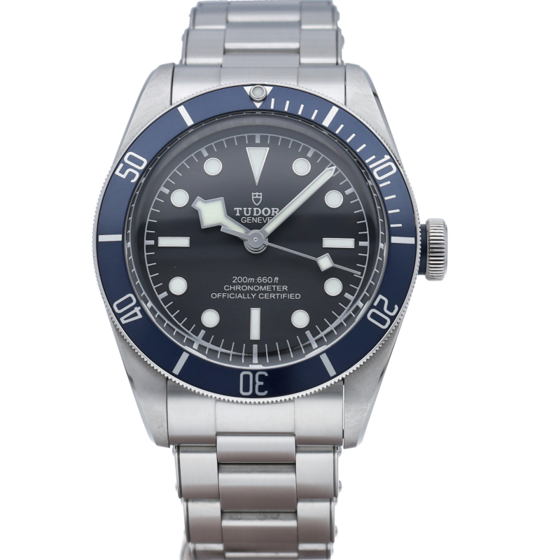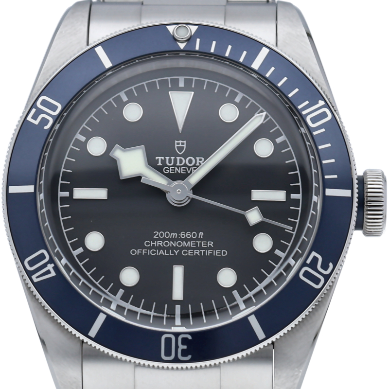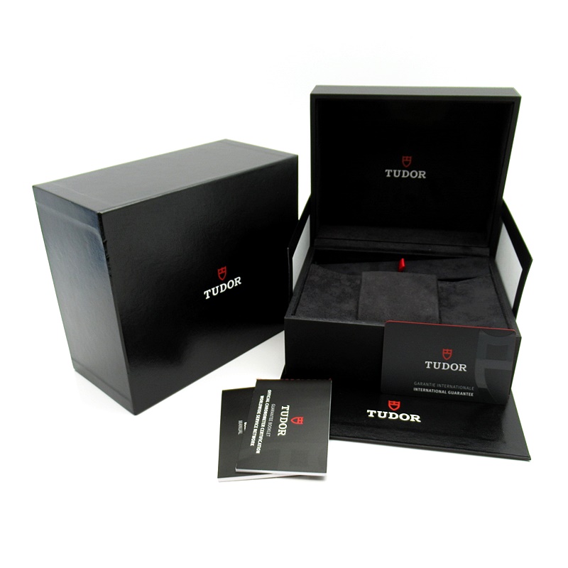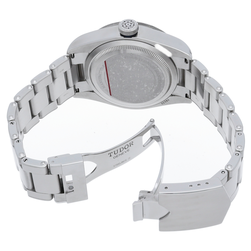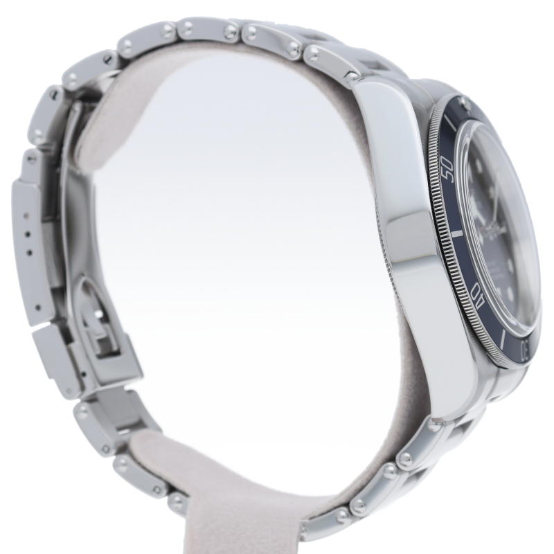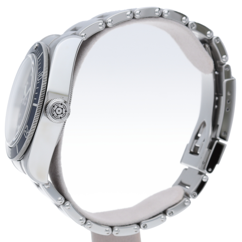 チューダーの初期のサブマリーナに使用されていた通称“イカ針”を採用した「ブラックベイ」2016年発表のニューモデルです。ダイヤルには現行タイプの「盾」マークがプリントされていますが、リューズトップにはヴィンテージ感の漂う「バラ」マークを刻印。ムーブメントにはCOSC公認のクロノメーターを取得した70時間パワーリザーブの自社製キャリバー「MT5602」を搭載。