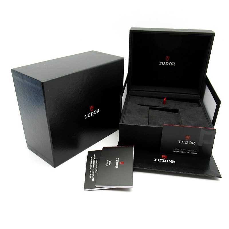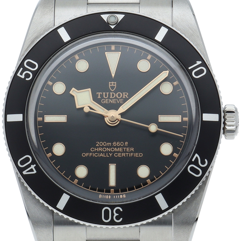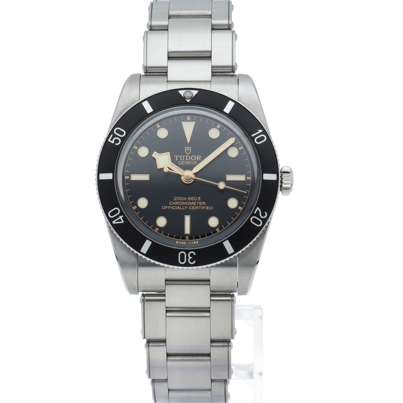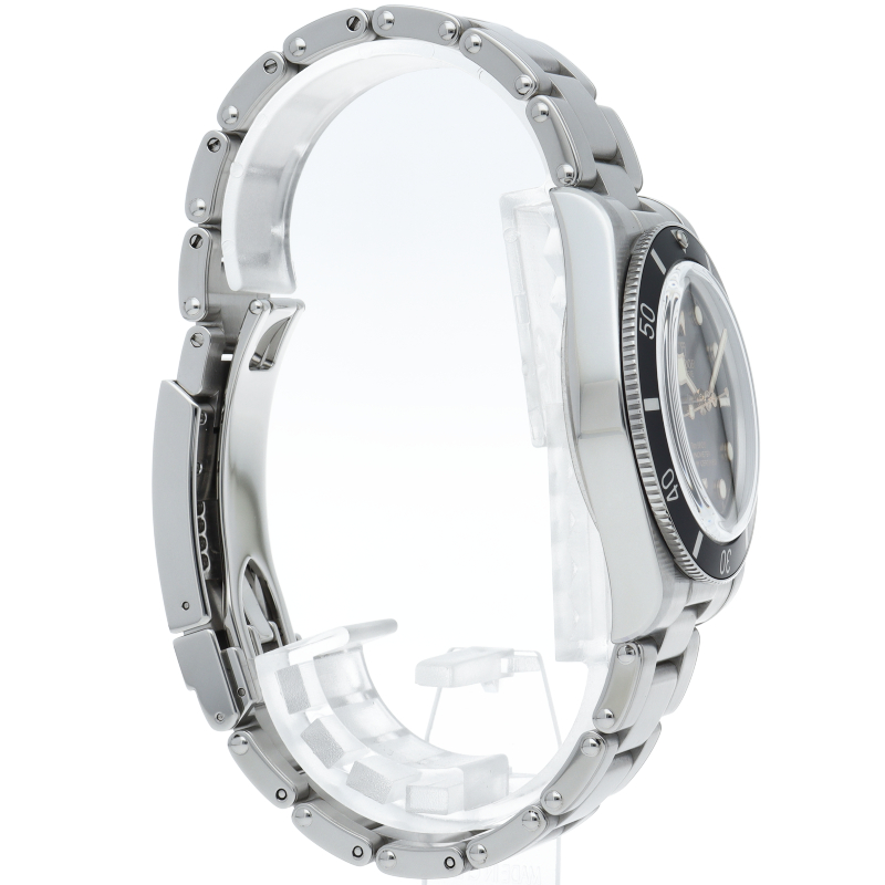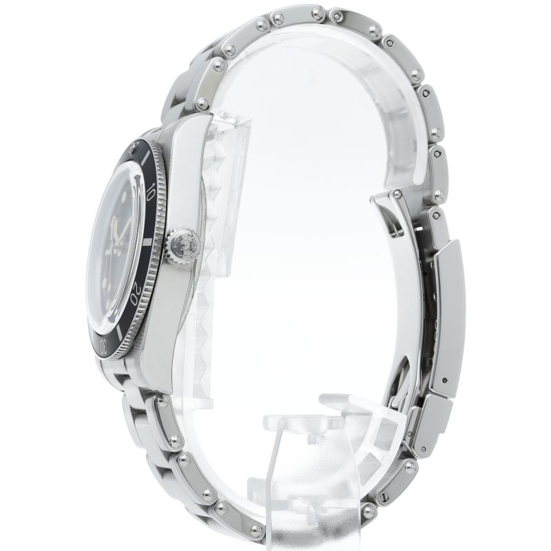 チューダーの初期のサブマリーナに使用されていた通称“イカ針”を採用した「ブラックベイ」。こちらはステンレスタイプで、ケース径37mmモデル。1960年代までのロレックスやチューダーに使われていたリベットブレス仕様のダイバーウォッチです。