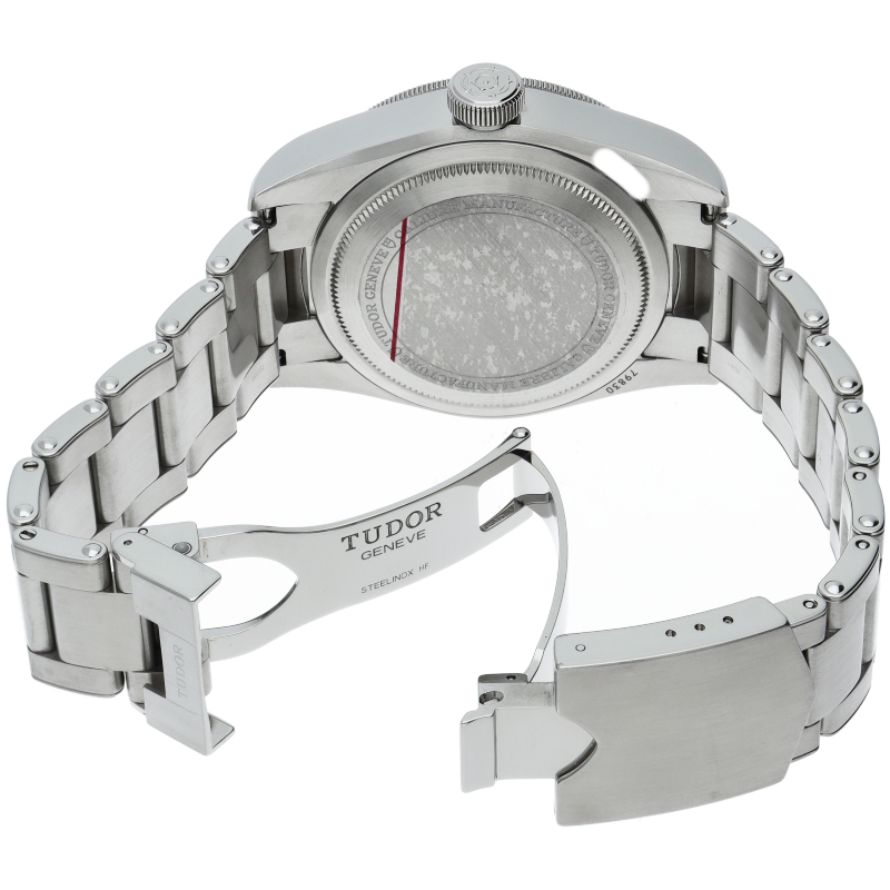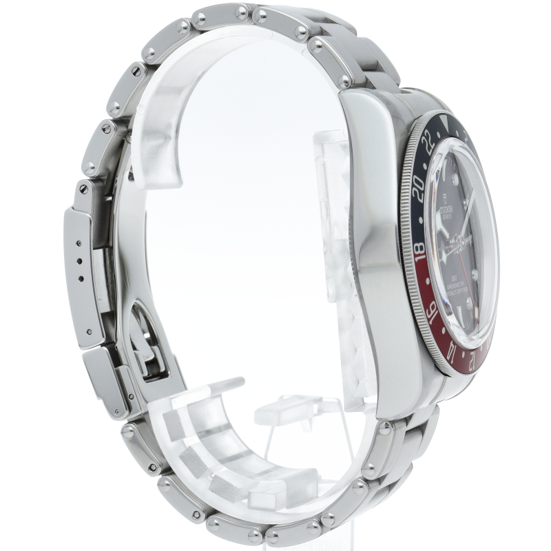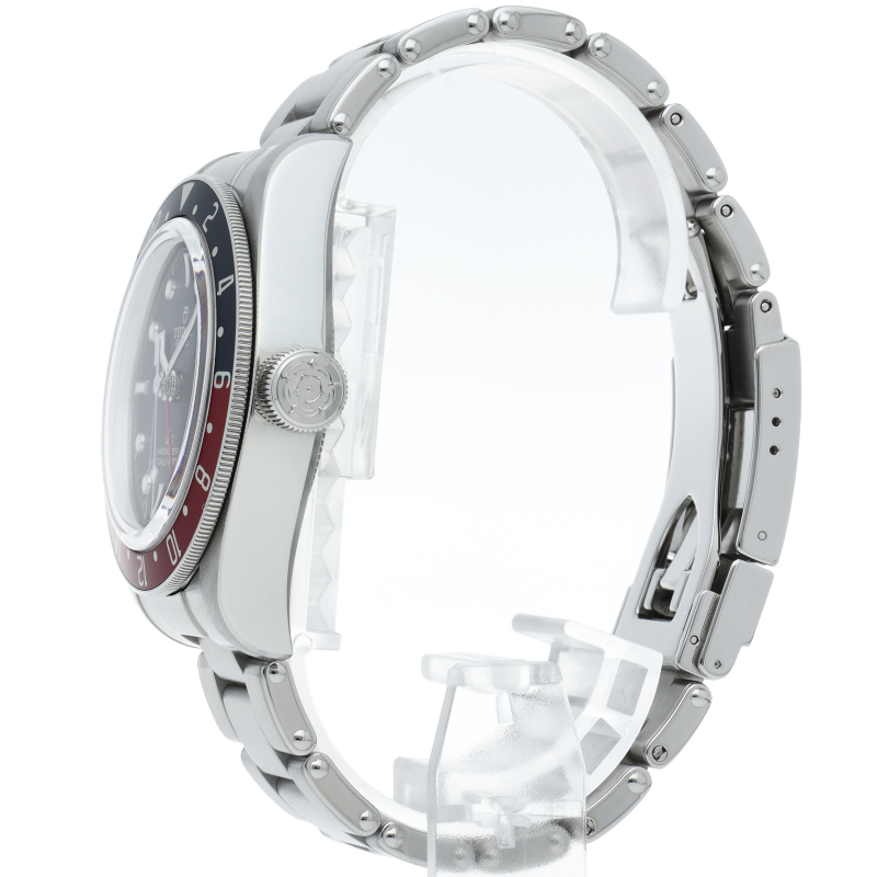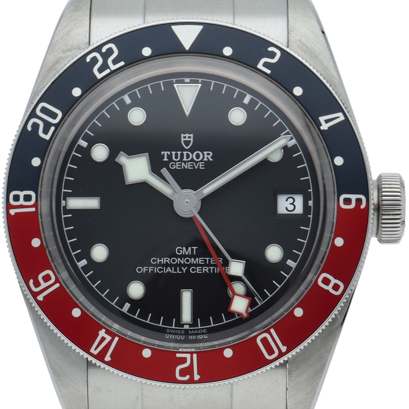 チュードルを代表するスポーツモデル「ブラックベイ」のGMT搭載モデル。ベゼルは昼夜がわかる様「ブルー/レッド」の2トーンの通称ペプシカラーとなっています。過去のダイバーズウォッチからインスピレーションを得た四角い針はGMT針にも付いています。自社製GMTムーブメント「MT5652」を搭載。70時間のパワーリザーブを誇り、クロノメーター認定を受けたムーブメントです。
