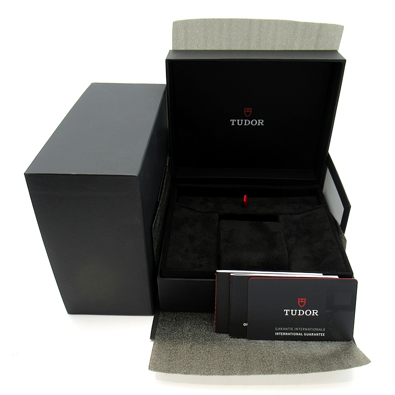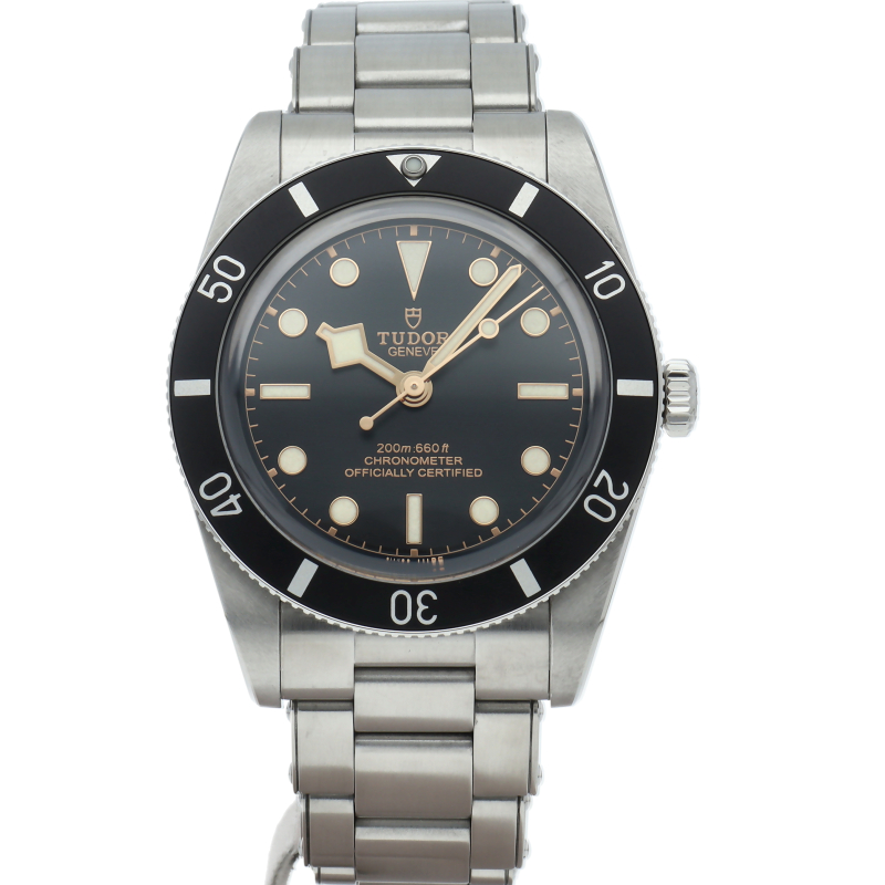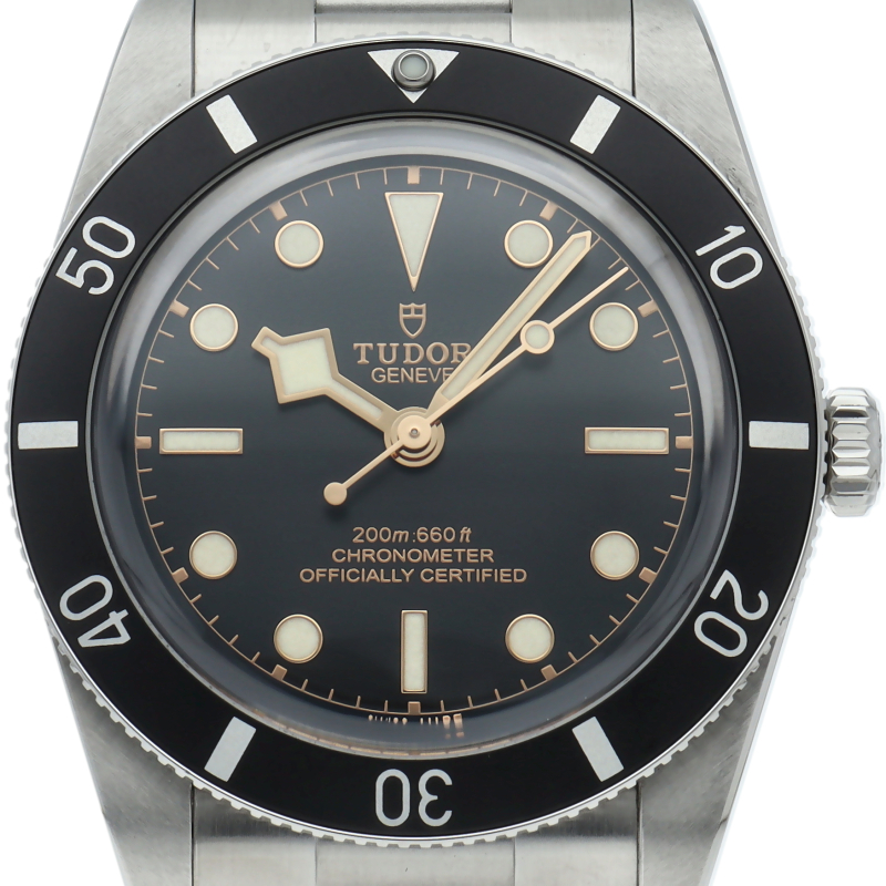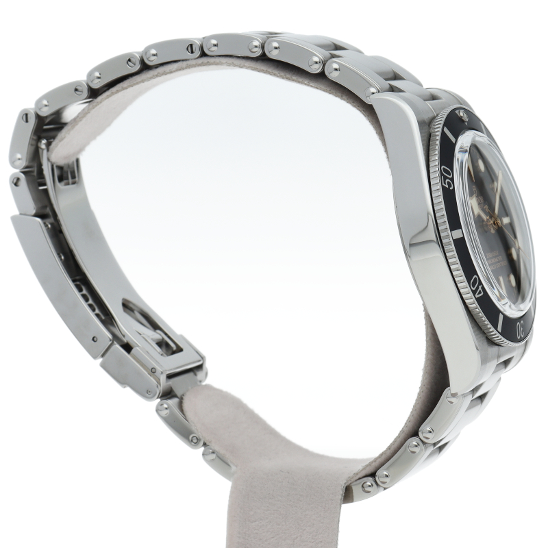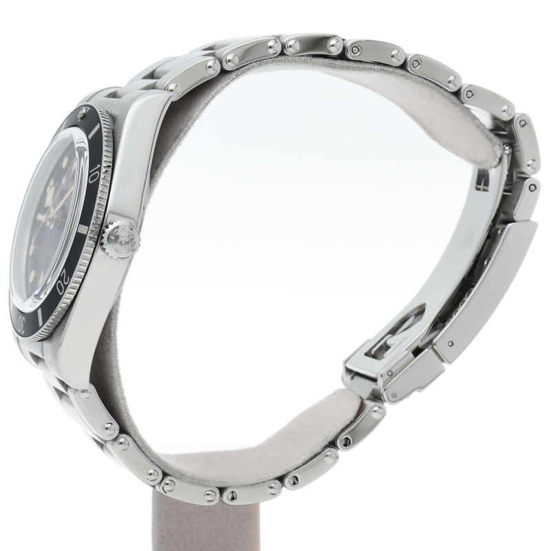 チューダーの初期のサブマリーナに使用されていた通称“イカ針”を採用した「ブラックベイ」。こちらはステンレスタイプで、ケース径37mmモデル。1960年代までのロレックスやチューダーに使われていたリベットブレス仕様のダイバーウォッチです。