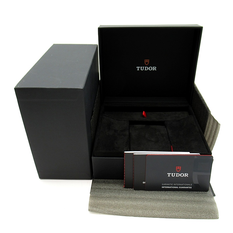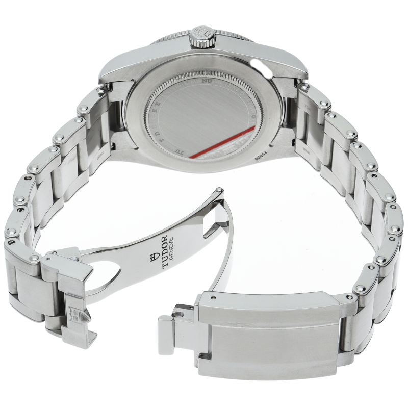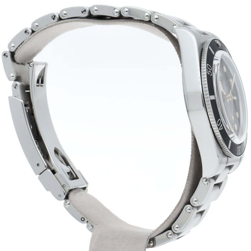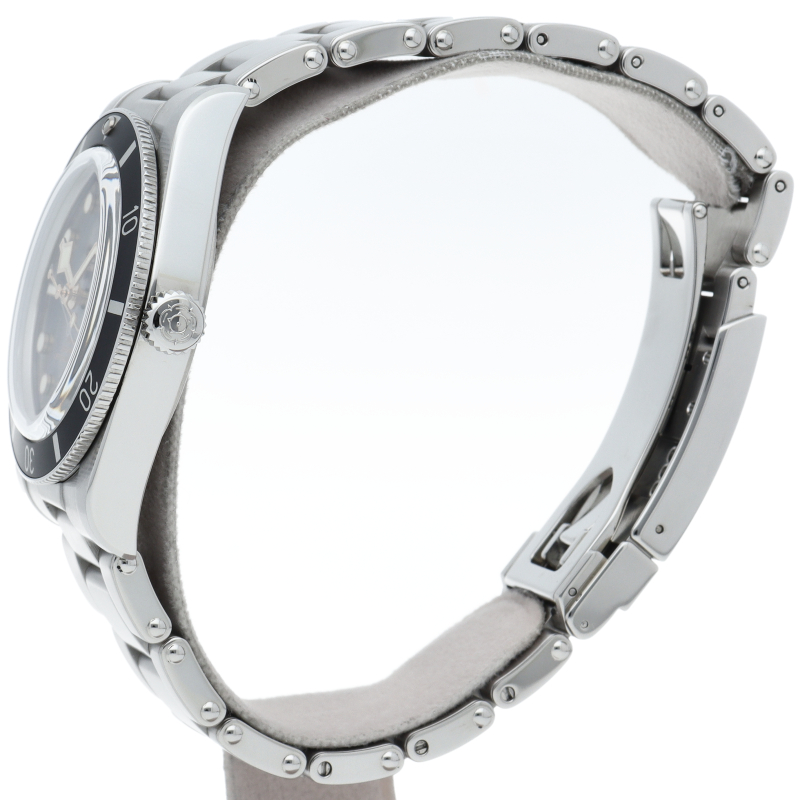 チューダーの初期のサブマリーナに使用されていた通称“イカ針”を採用した「ブラックベイ」。こちらはステンレスタイプで、ケース径37mmモデル。1960年代までのロレックスやチューダーに使われていたリベットブレス仕様のダイバーウォッチです。