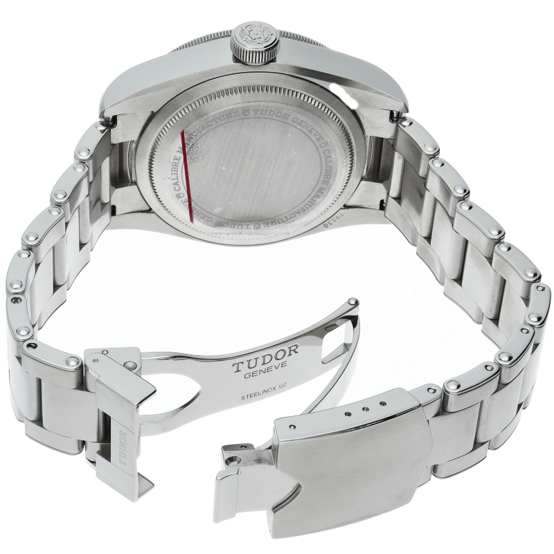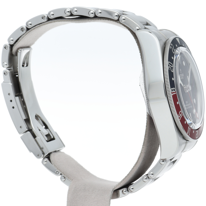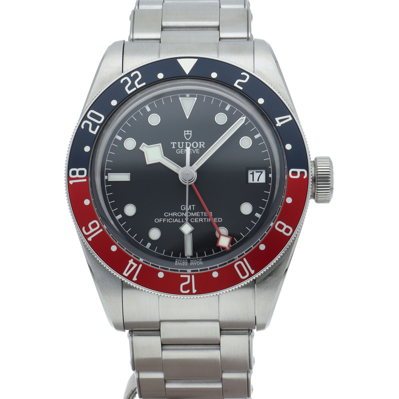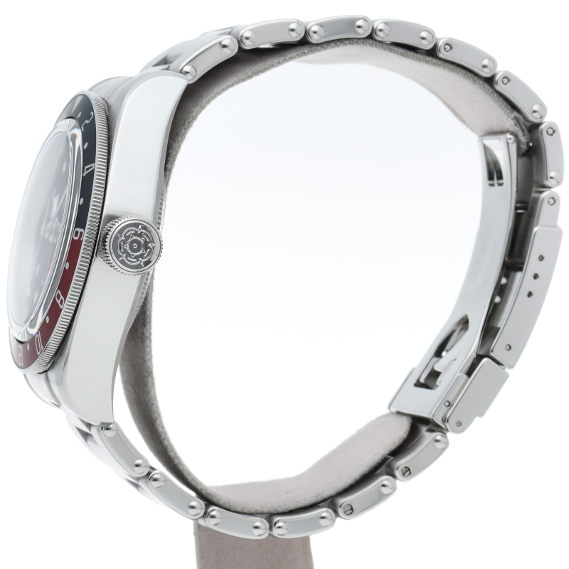 チュードルを代表するスポーツモデル「ブラックベイ」のGMT搭載モデル。ベゼルは昼夜がわかる様「ブルー/レッド」の2トーンの通称ペプシカラーとなっています。過去のダイバーズウォッチからインスピレーションを得た四角い針はGMT針にも付いています。自社製GMTムーブメント「MT5652」を搭載。70時間のパワーリザーブを誇り、クロノメーター認定を受けたムーブメントです。