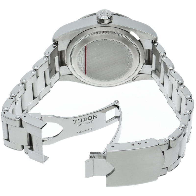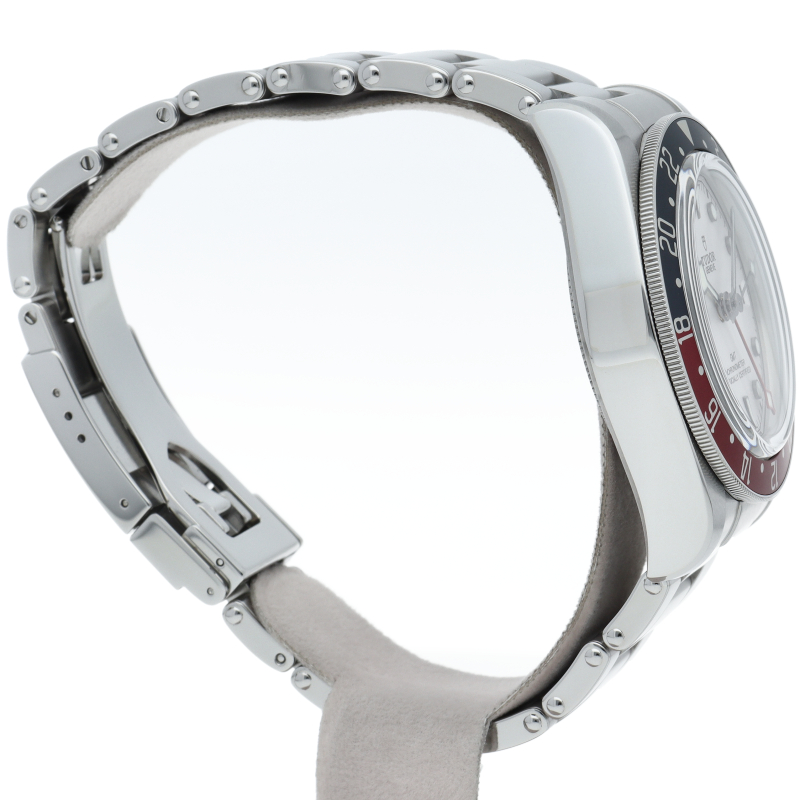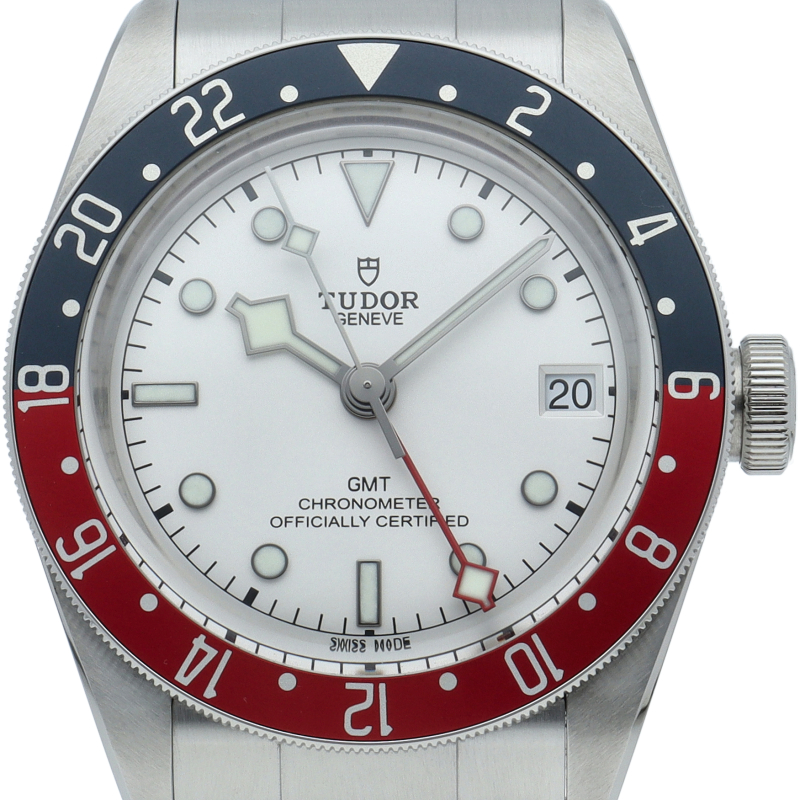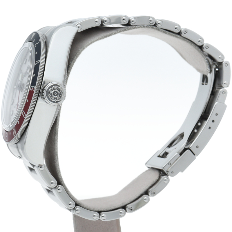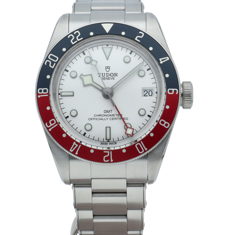 チュードルを代表するスポーツモデル「ブラックベイ」のGMT搭載モデル。ベゼルは昼夜がわかる様「ブルー/レッド」の2トーンの通称ペプシカラーとなっています。過去のダイバーズウォッチからインスピレーションを得た四角い針はGMT針にも付いています。自社製GMTムーブメント「MT5652」を搭載。70時間のパワーリザーブを誇り、クロノメーター認定を受けたムーブメントです。