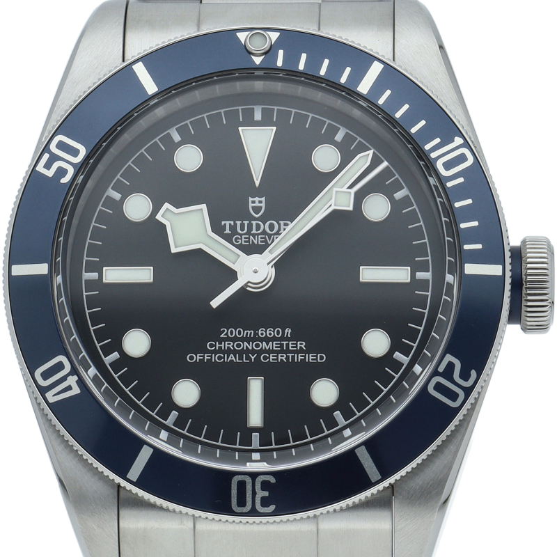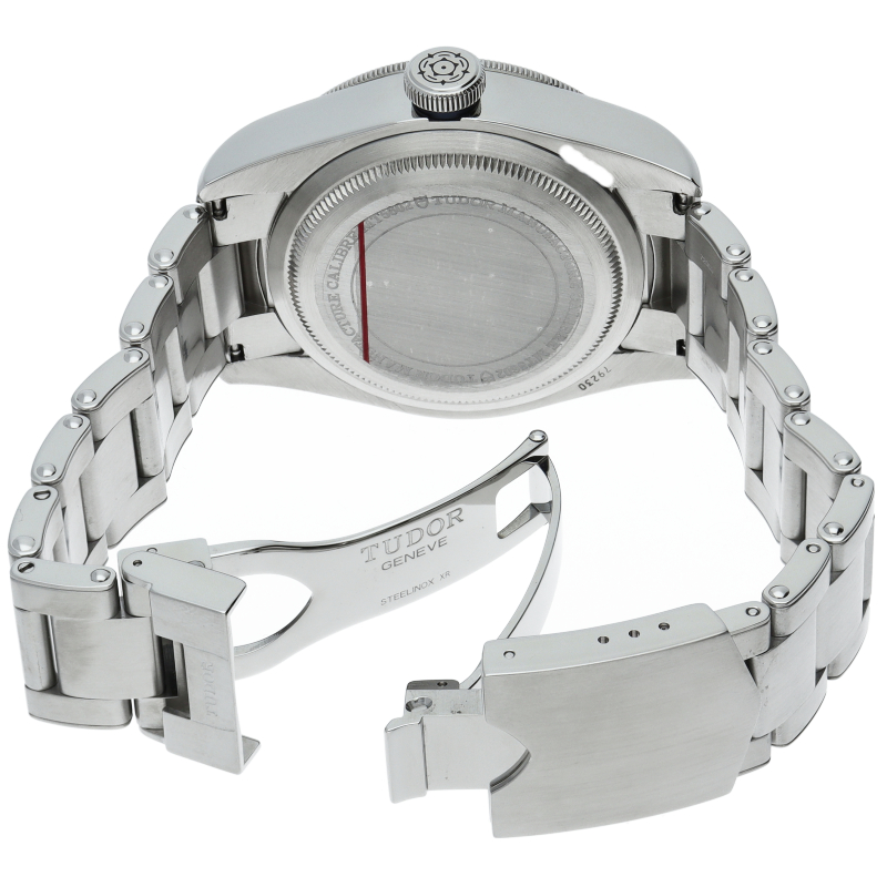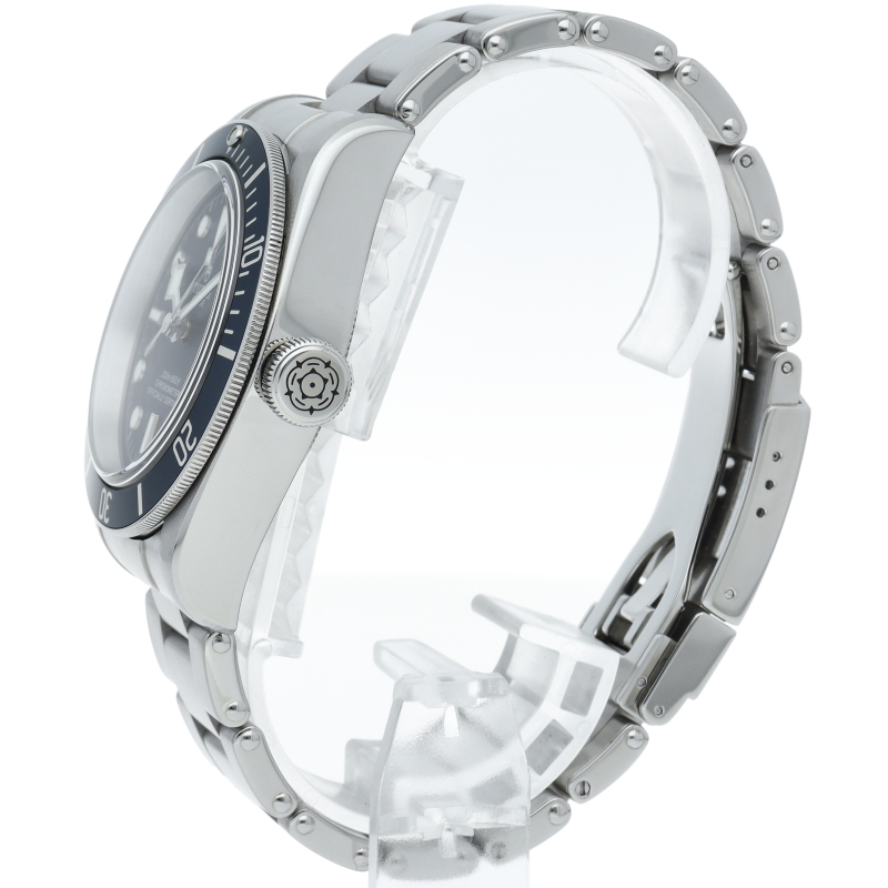 チューダーの初期のサブマリーナに使用されていた通称“イカ針”を採用した「ブラックベイ」2016年発表のニューモデルです。ダイヤルには現行タイプの「盾」マークがプリントされていますが、リューズトップにはヴィンテージ感の漂う「バラ」マークを刻印。ムーブメントにはCOSC公認のクロノメーターを取得した70時間パワーリザーブの自社製キャリバー「MT5602」を搭載。