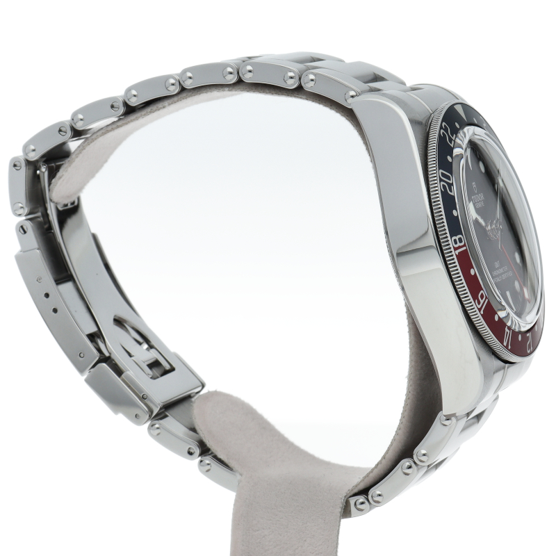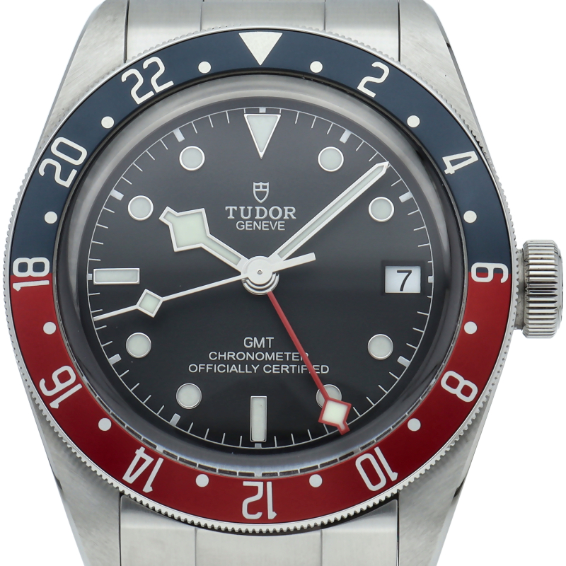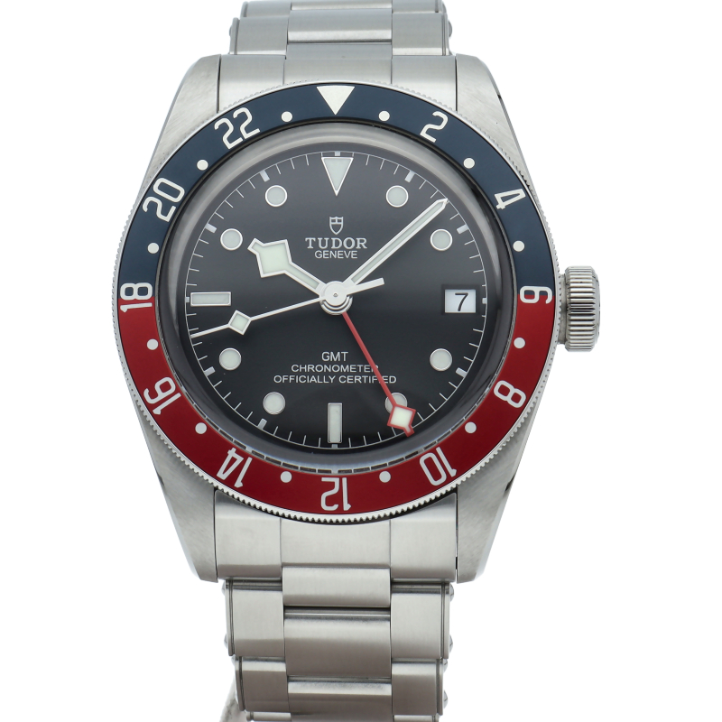 チュードルを代表するスポーツモデル「ブラックベイ」のGMT搭載モデル。ベゼルは昼夜がわかる様「ブルー/レッド」の2トーンの通称ペプシカラーとなっています。過去のダイバーズウォッチからインスピレーションを得た四角い針はGMT針にも付いています。自社製GMTムーブメント「MT5652」を搭載。70時間のパワーリザーブを誇り、クロノメーター認定を受けたムーブメントです。