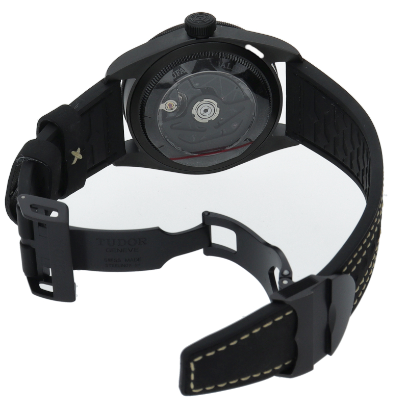 チューダーといえばブラックベイ。79210CNUは同シリーズの新たなる定番として製造された次世代モデルです。ケースにはブラックセラミックが採用され、ベルトも文字盤も合わせてオールブラック仕様となっております。時針にはチューダーの特徴とも言えるスノーフレーク針(イカ針)。ムーブメントには2021年、当新作で初搭載となる「MT5602-1U」が採用されました。
