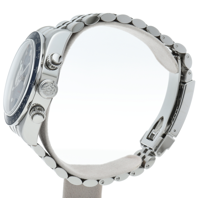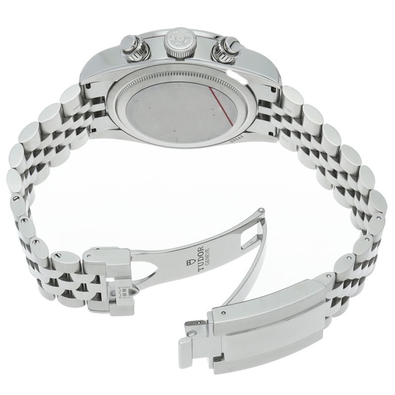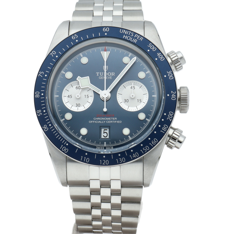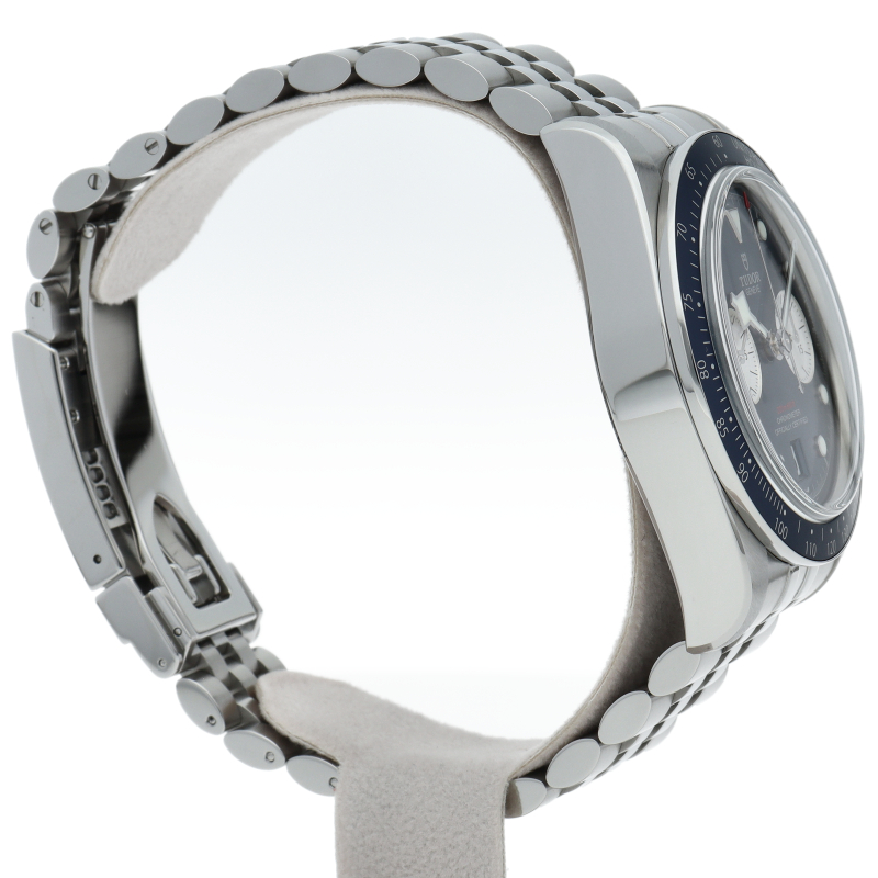 チューダーダイバーズウォッチのアイコンとなっている「スノーフレーク針」と初期のチューダー クロノグラフから着想を得た、45分カウンターと6時位置のカレンダーはそのままに、鮮やかなブルーのダイヤルとベゼルを備えます。セルフアジャストが可能な“T-fit”クラスプを搭載し、簡単な操作で8mmの長さを5段階で調節可能になっており自分にぴったりなつけ心地に調整することができます。