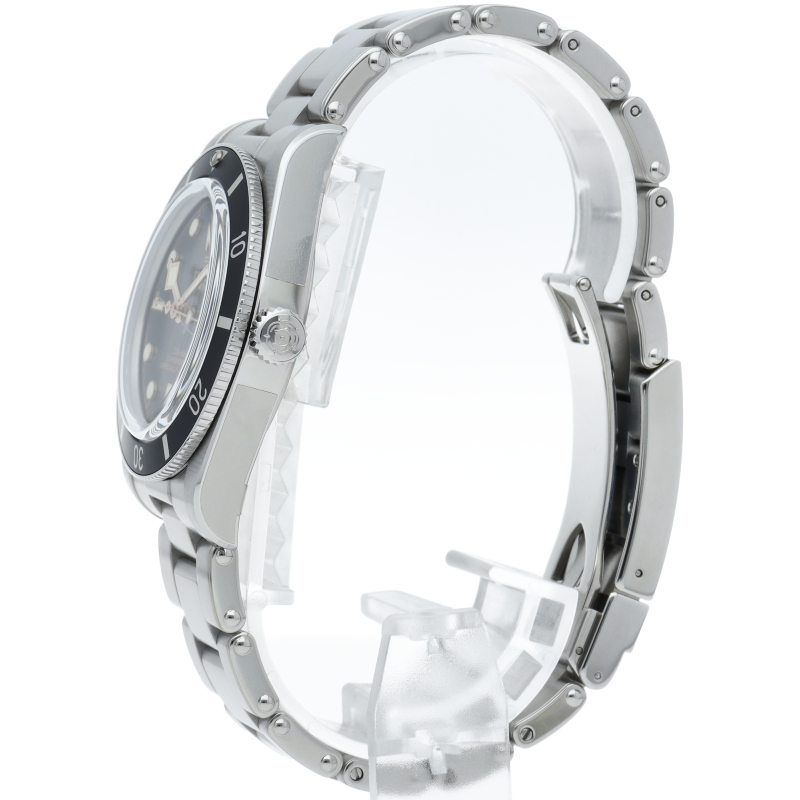 チューダーの初期のサブマリーナに使用されていた通称“イカ針”を採用した「ブラックベイ」。こちらはステンレスタイプで、ケース径37mmモデル。1960年代までのロレックスやチューダーに使われていたリベットブレス仕様のダイバーウォッチです。