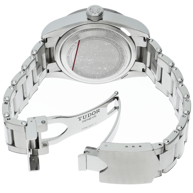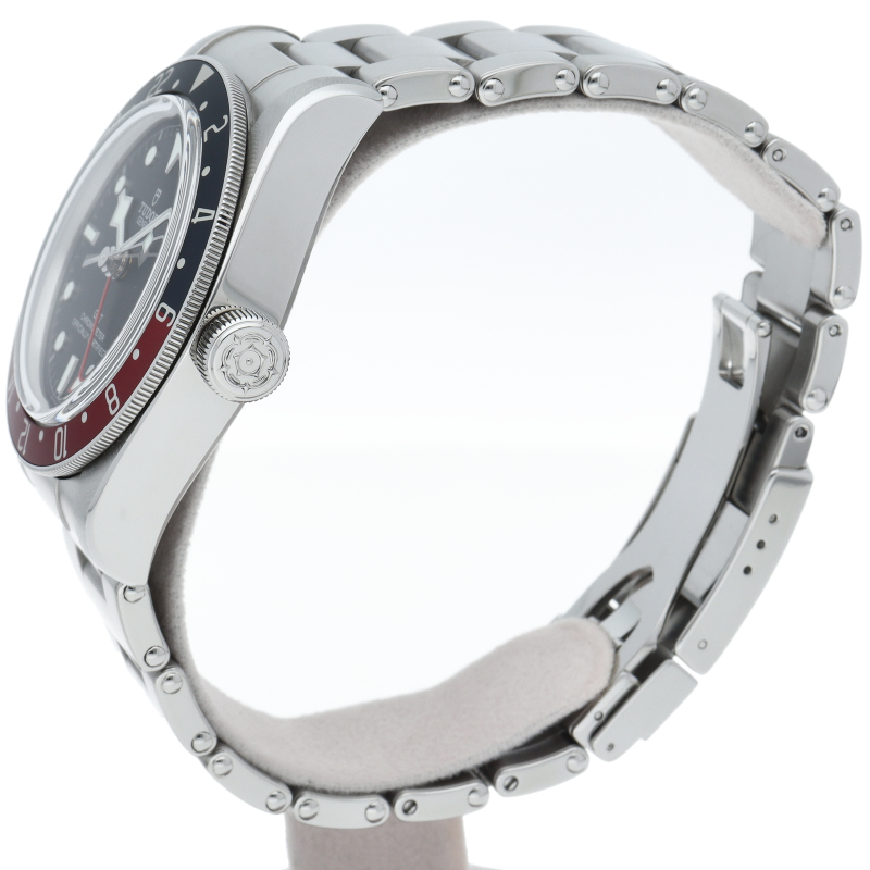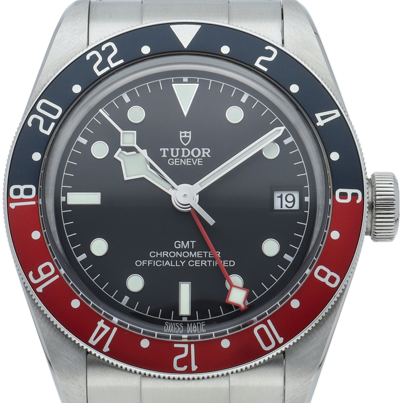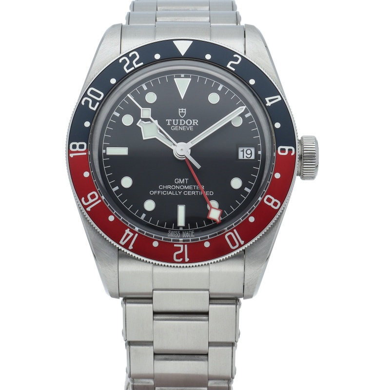 チュードルを代表するスポーツモデル「ブラックベイ」のGMT搭載モデル。ベゼルは昼夜がわかる様「ブルー/レッド」の2トーンの通称ペプシカラーとなっています。過去のダイバーズウォッチからインスピレーションを得た四角い針はGMT針にも付いています。自社製GMTムーブメント「MT5652」を搭載。70時間のパワーリザーブを誇り、クロノメーター認定を受けたムーブメントです。