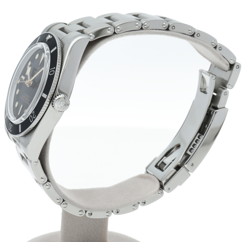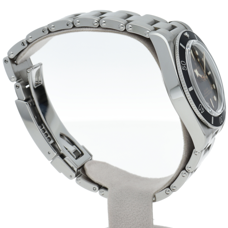 チューダーの初期のサブマリーナに使用されていた通称“イカ針”を採用した「ブラックベイ」。こちらはステンレスタイプで、ケース径37mmモデル。1960年代までのロレックスやチューダーに使われていたリベットブレス仕様のダイバーウォッチです。