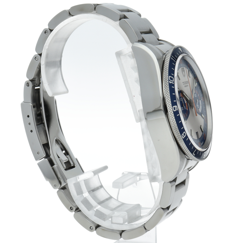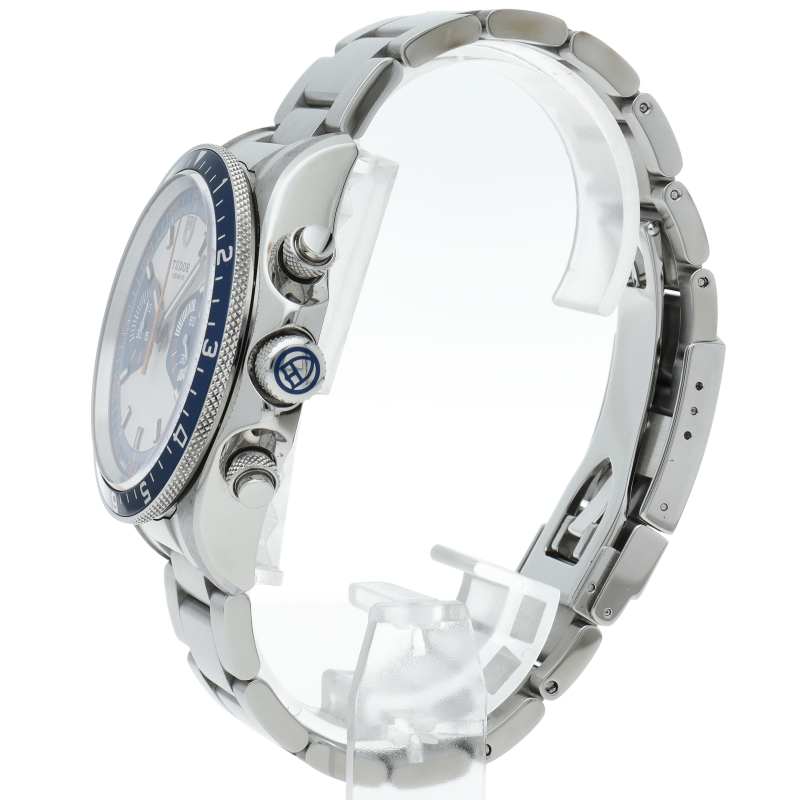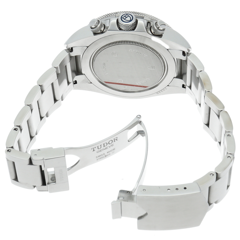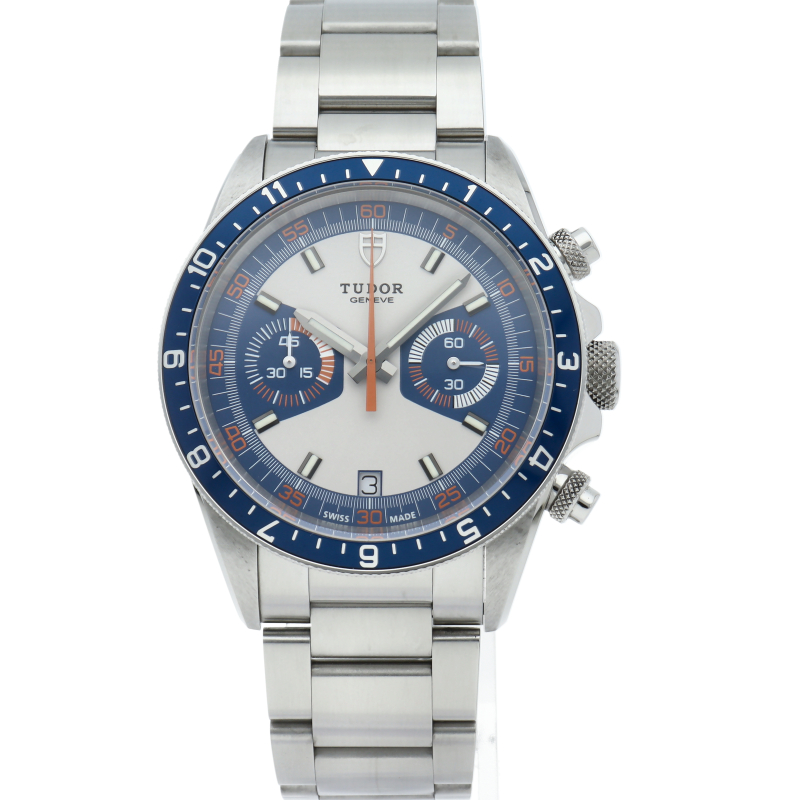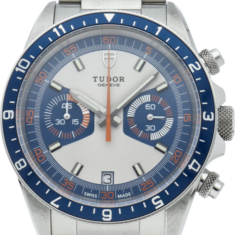 チュードルの人気のモンテカルロの復刻版です。青いベゼルとオレンジの針が独特なデザインです。クロノグラフ機能付きですので機能性も抜群。ブレスレットは、新開発の3連オイスタータイプです。