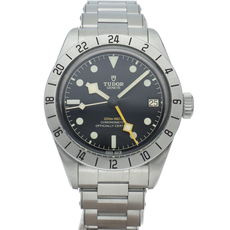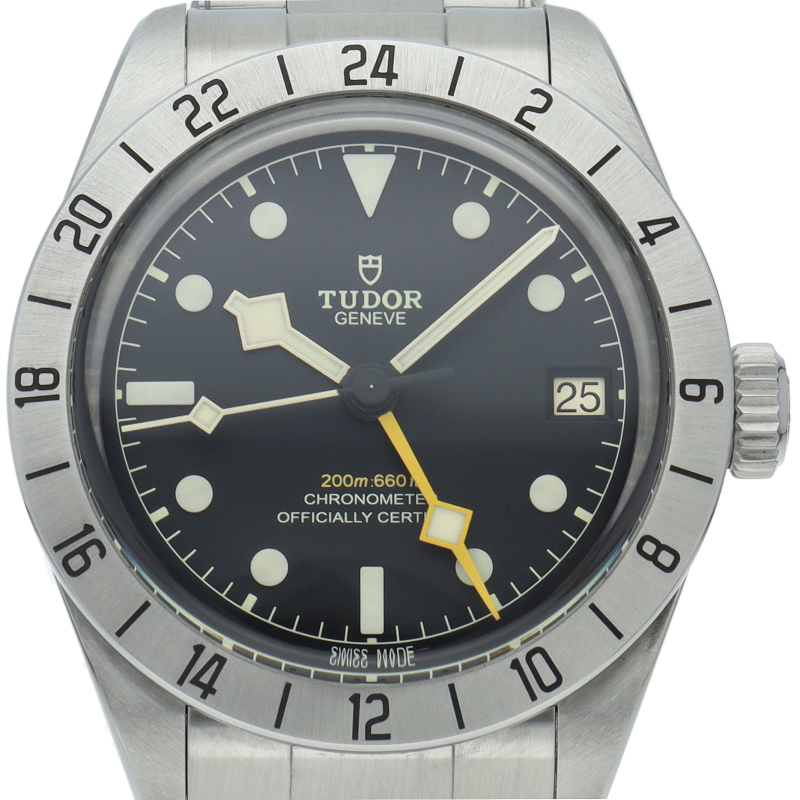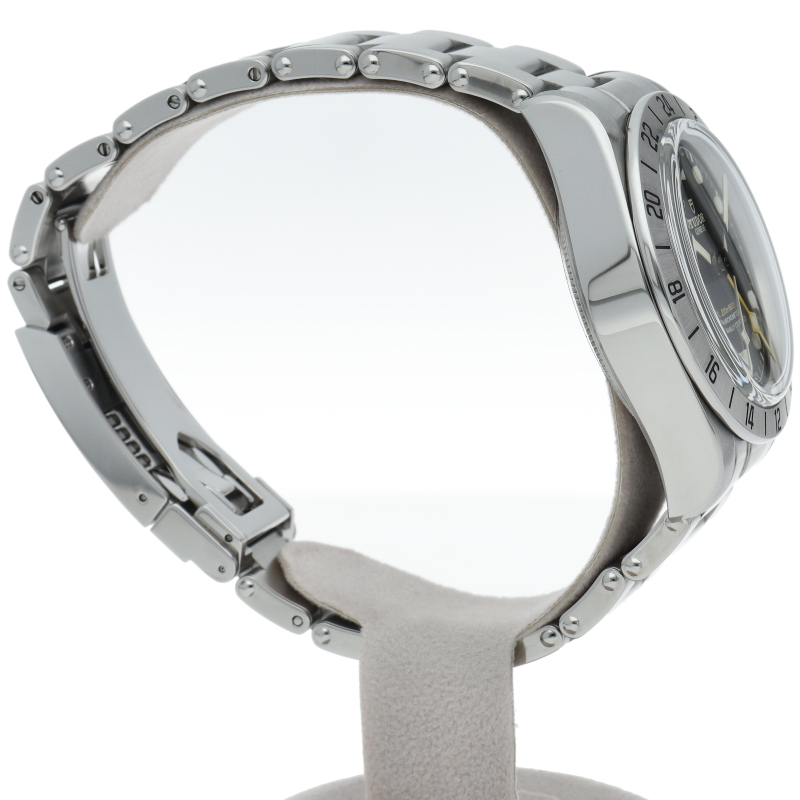 固定式のベゼルに刻印された24時間表示、大きめのイエローの24時間針等、ロレックスの初代エクスプローラー2を彷彿とさせるデザインで話題を呼んだブラックベイプロ。人気機種のフィフティーエイトと同じ39ミリケースを採用しており、日本人の手首周りにも馴染みやすいKサイズ感です。ムーブメントはクロノメーター認定を受け70時間のパワーリザーブを有する、両方向巻上げ式の自社製MT5652を搭載しています。