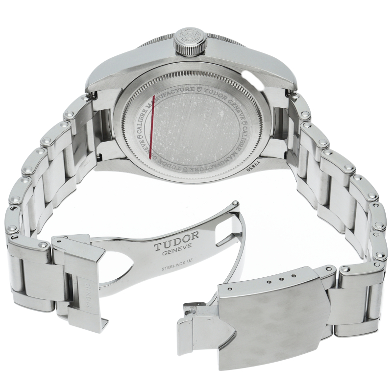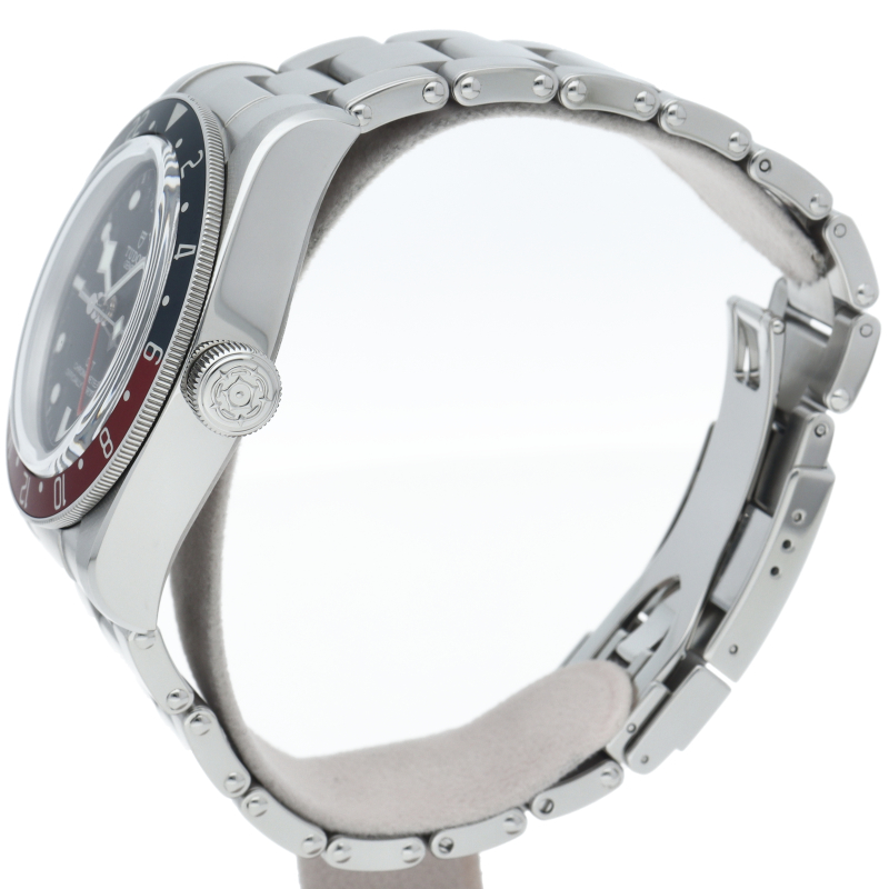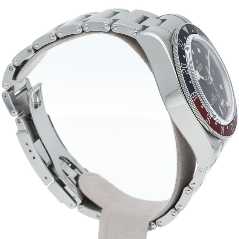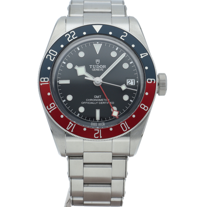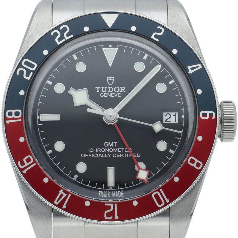 チュードルを代表するスポーツモデル「ブラックベイ」のGMT搭載モデル。ベゼルは昼夜がわかる様「ブルー/レッド」の2トーンの通称ペプシカラーとなっています。過去のダイバーズウォッチからインスピレーションを得た四角い針はGMT針にも付いています。自社製GMTムーブメント「MT5652」を搭載。70時間のパワーリザーブを誇り、クロノメーター認定を受けたムーブメントです。