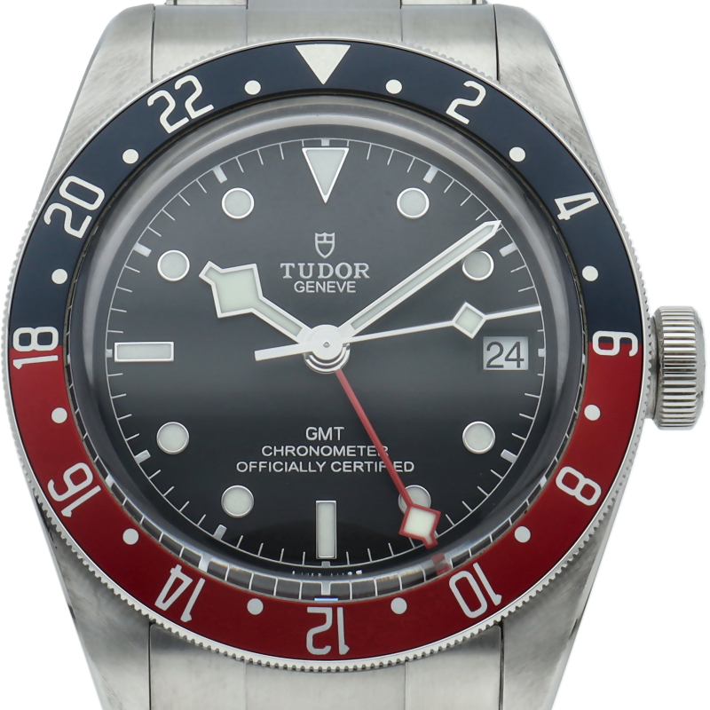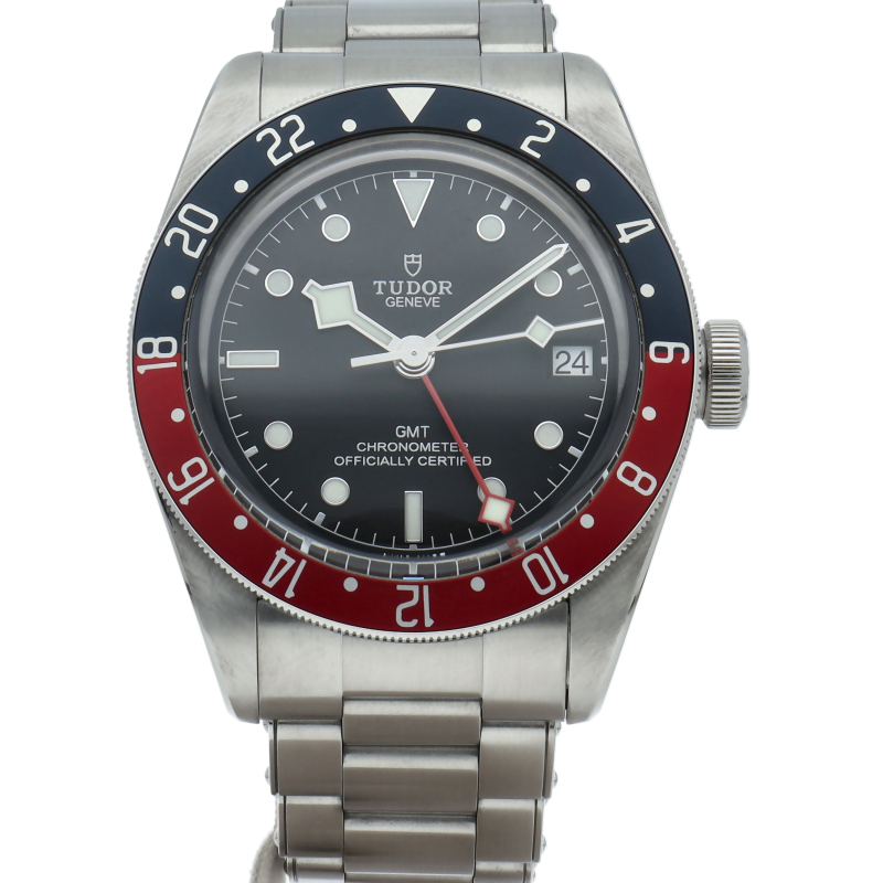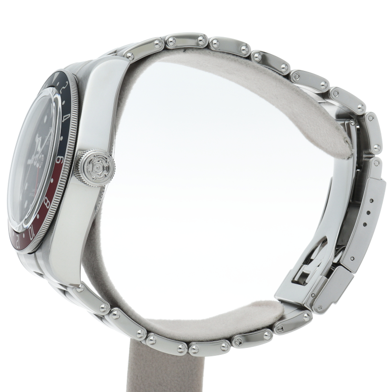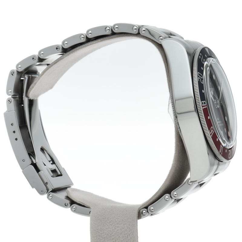 チュードルを代表するスポーツモデル「ブラックベイ」のGMT搭載モデル。ベゼルは昼夜がわかる様「ブルー/レッド」の2トーンの通称ペプシカラーとなっています。過去のダイバーズウォッチからインスピレーションを得た四角い針はGMT針にも付いています。自社製GMTムーブメント「MT5652」を搭載。70時間のパワーリザーブを誇り、クロノメーター認定を受けたムーブメントです。