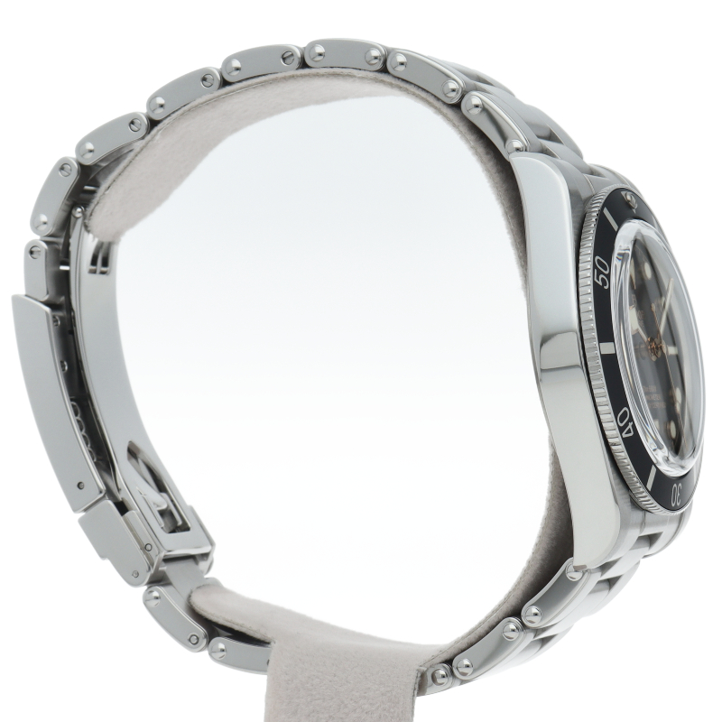 チューダーの初期のサブマリーナに使用されていた通称“イカ針”を採用した「ブラックベイ」。こちらはステンレスタイプで、ケース径37mmモデル。1960年代までのロレックスやチューダーに使われていたリベットブレス仕様のダイバーウォッチです。
