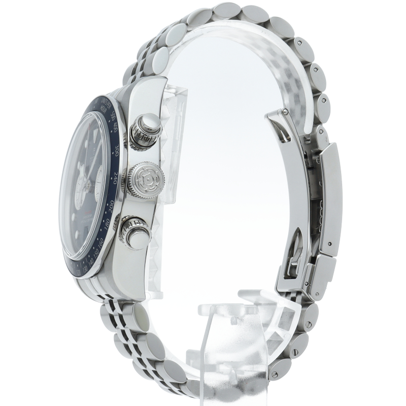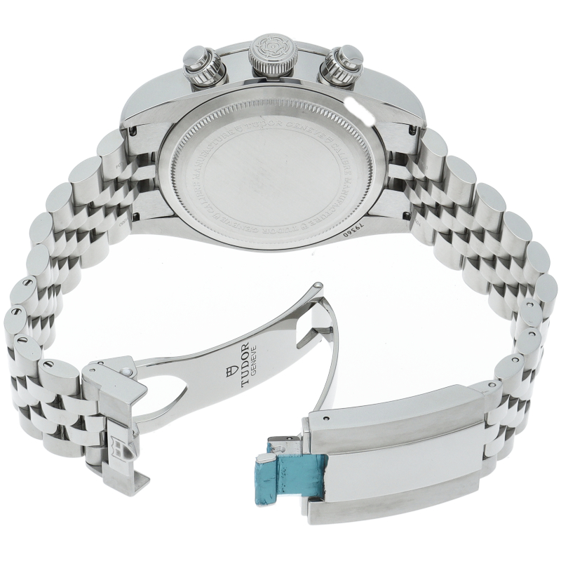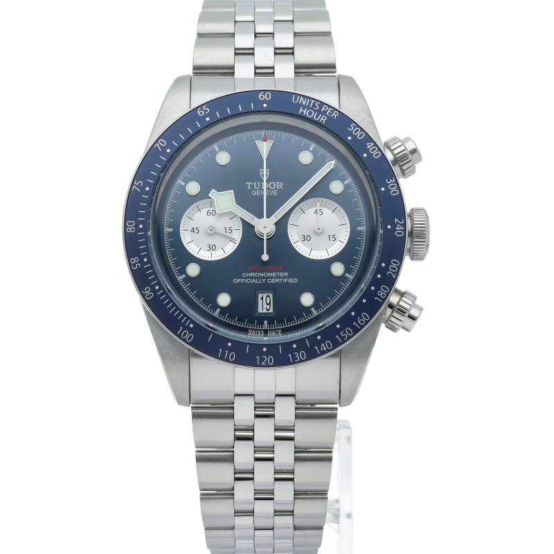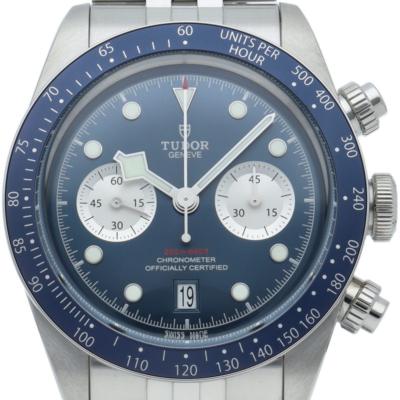 チューダーダイバーズウォッチのアイコンとなっている「スノーフレーク針」と初期のチューダークロノグラフから着想を得た、45分カウンターと6時位置のカレンダーはそのままに、鮮やかなブルーのダイヤルとベゼルを備えます。セルフアジャストが可能な“T-fit”クラスプを搭載し、簡単な操作で8mmの長さを5段階で調節可能になっており自分にぴったりなつけ心地に調整することができます。