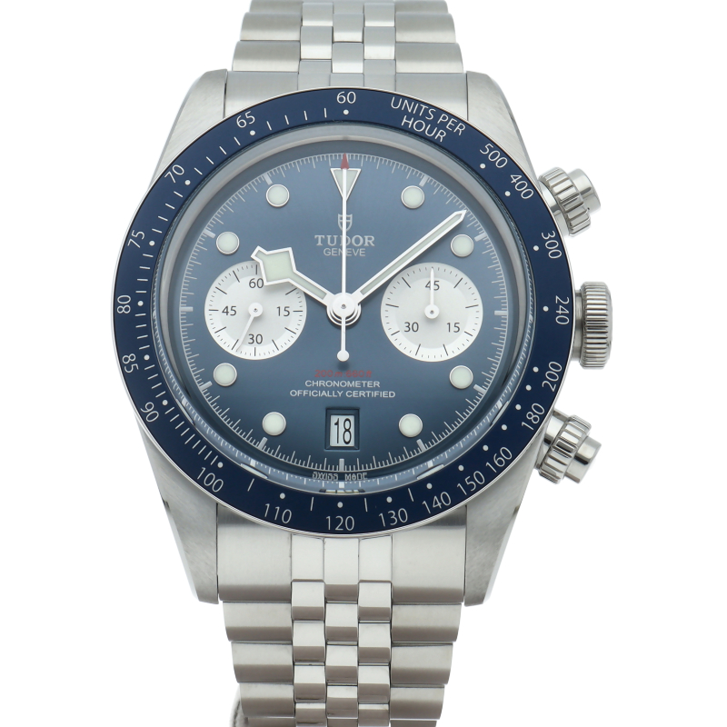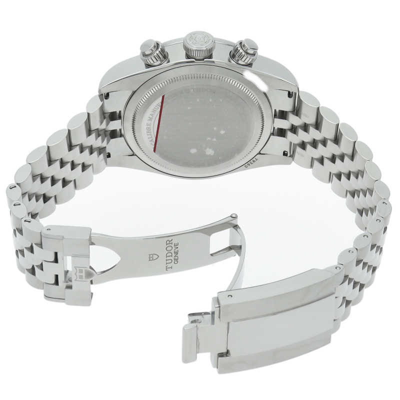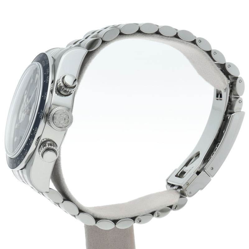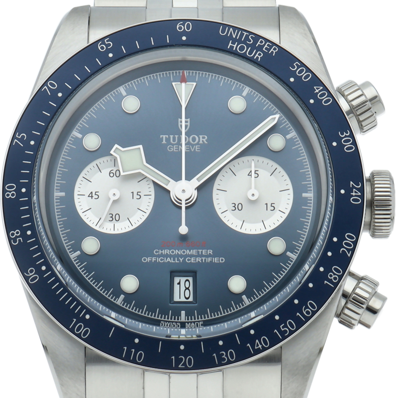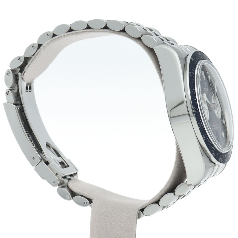 チューダーダイバーズウォッチのアイコンとなっている「スノーフレーク針」と初期のチューダー クロノグラフから着想を得た、45分カウンターと6時位置のカレンダーはそのままに、鮮やかなブルーのダイヤルとベゼルを備えます。セルフアジャストが可能な“T-fit”クラスプを搭載し、簡単な操作で8mmの長さを5段階で調節可能になっており自分にぴったりなつけ心地に調整することができます。