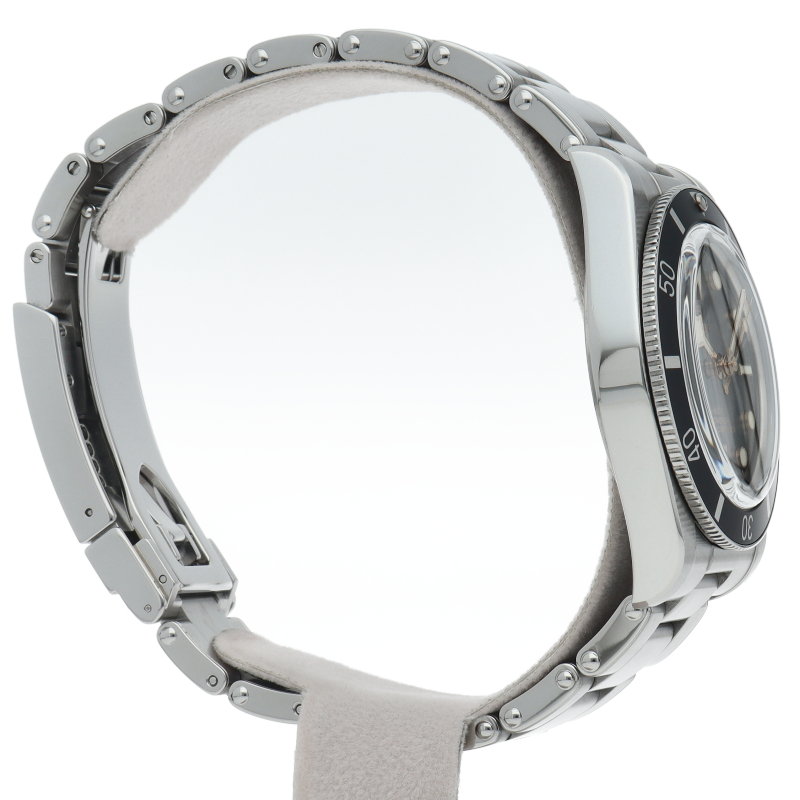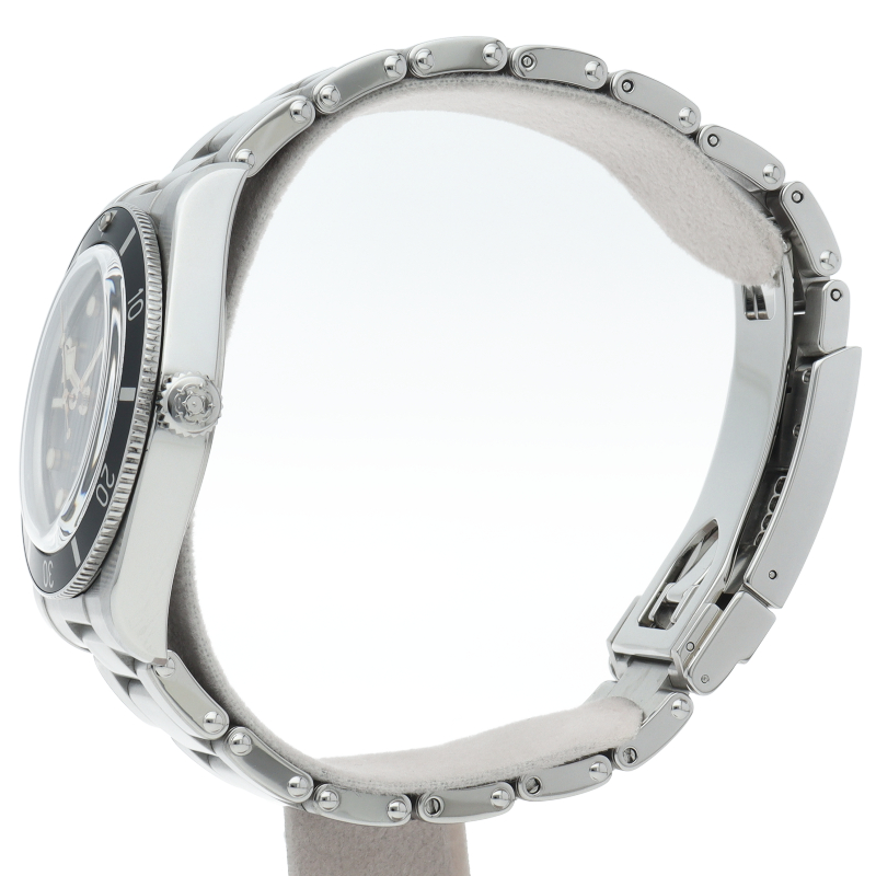 チューダーの初期のサブマリーナに使用されていた通称“イカ針”を採用した「ブラックベイ」。こちらはステンレスタイプで、ケース径37mmモデル。1960年代までのロレックスやチューダーに使われていたリベットブレス仕様のダイバーウォッチです。