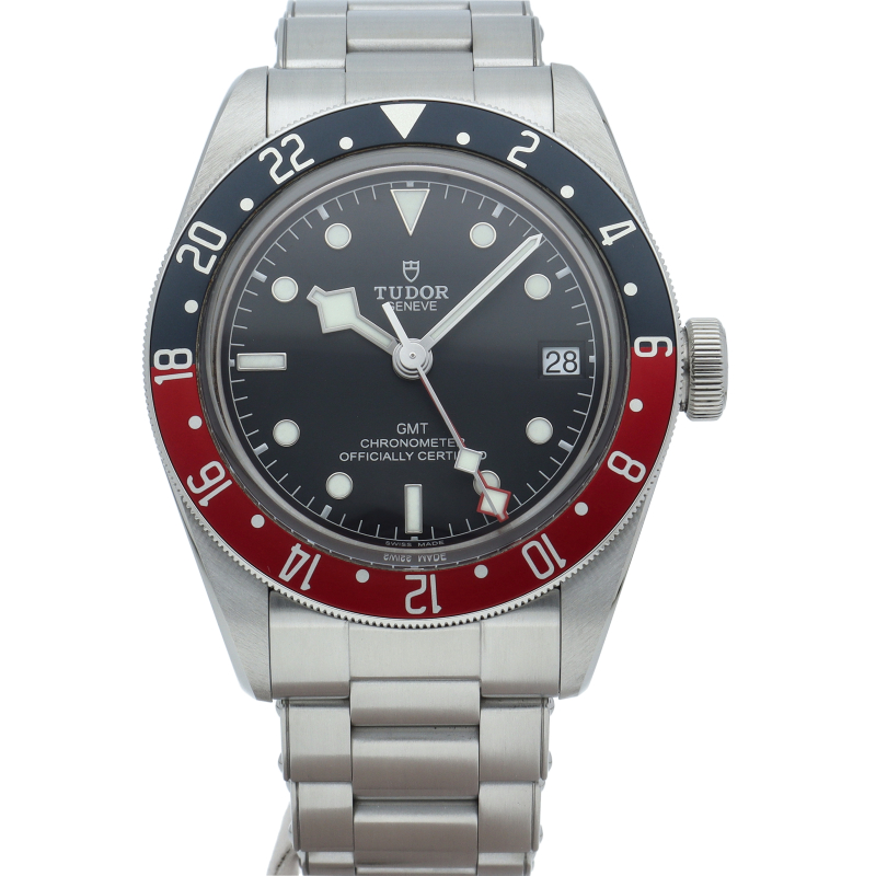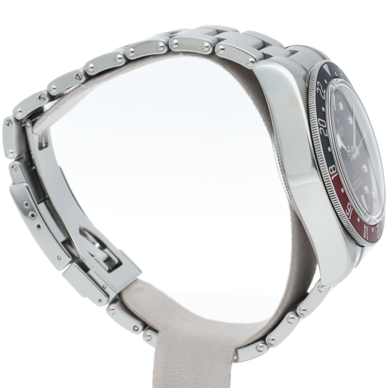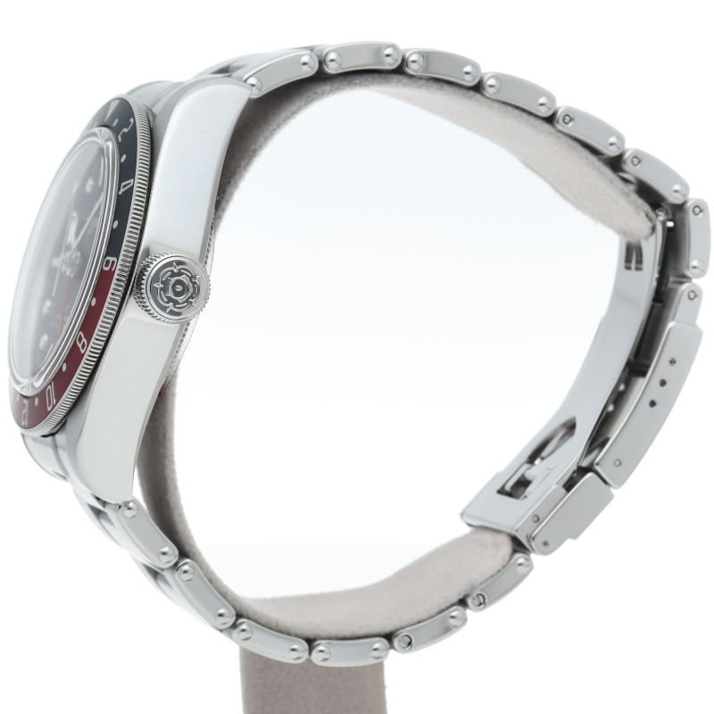 チュードルを代表するスポーツモデル「ブラックベイ」のGMT搭載モデル。ベゼルは昼夜がわかる様「ブルー/レッド」の2トーンの通称ペプシカラーとなっています。過去のダイバーズウォッチからインスピレーションを得た四角い針はGMT針にも付いています。自社製GMTムーブメント「MT5652」を搭載。70時間のパワーリザーブを誇り、クロノメーター認定を受けたムーブメントです。