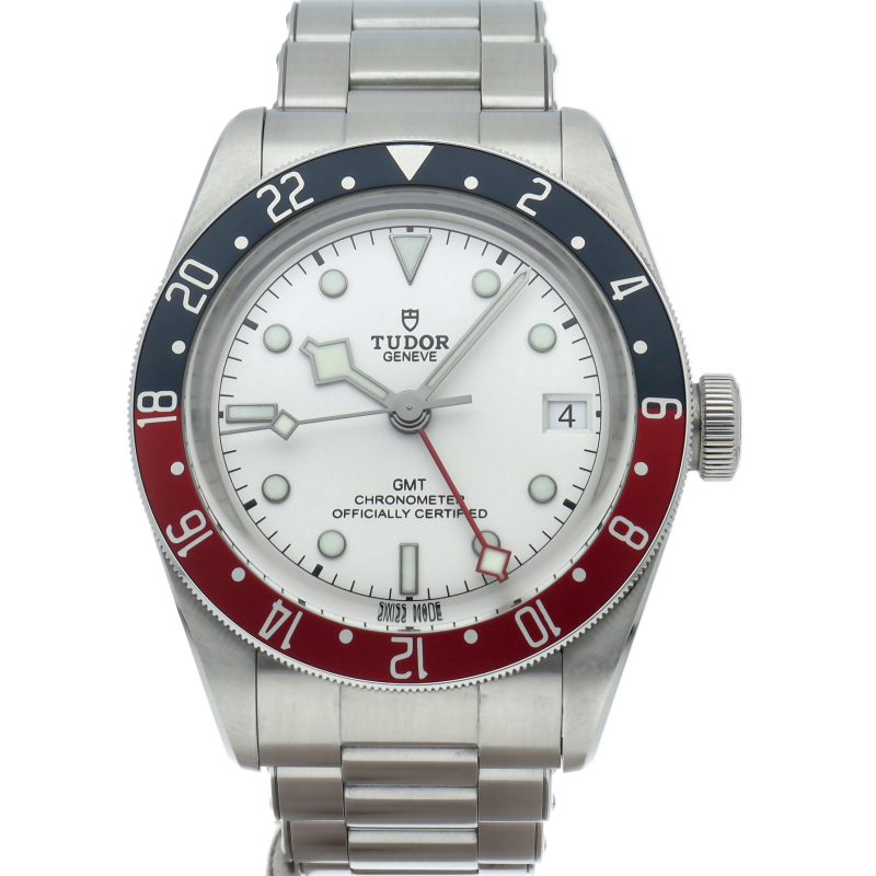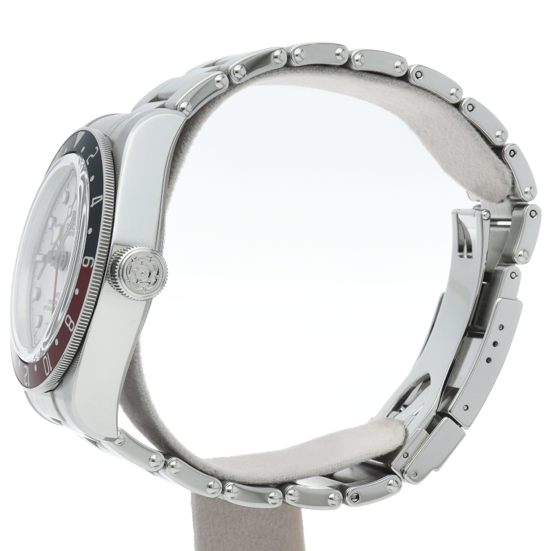 チュードルを代表するスポーツモデル「ブラックベイ」のGMT搭載モデル。ベゼルは昼夜がわかる様「ブルー/レッド」の2トーンの通称ペプシカラーとなっています。過去のダイバーズウォッチからインスピレーションを得た四角い針はGMT針にも付いています。自社製GMTムーブメント「MT5652」を搭載。70時間のパワーリザーブを誇り、クロノメーター認定を受けたムーブメントです。