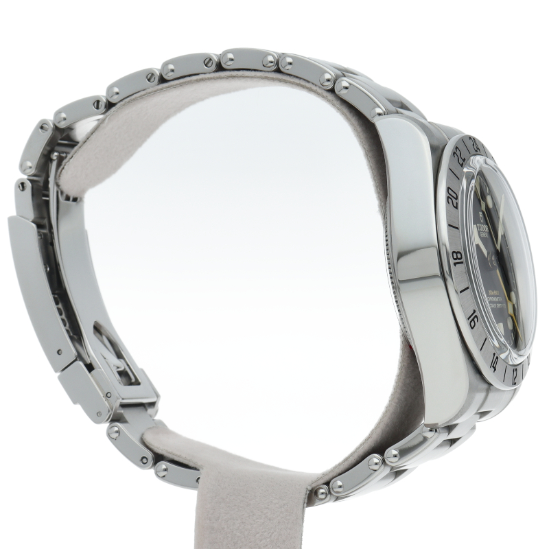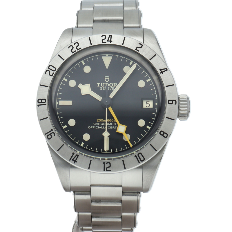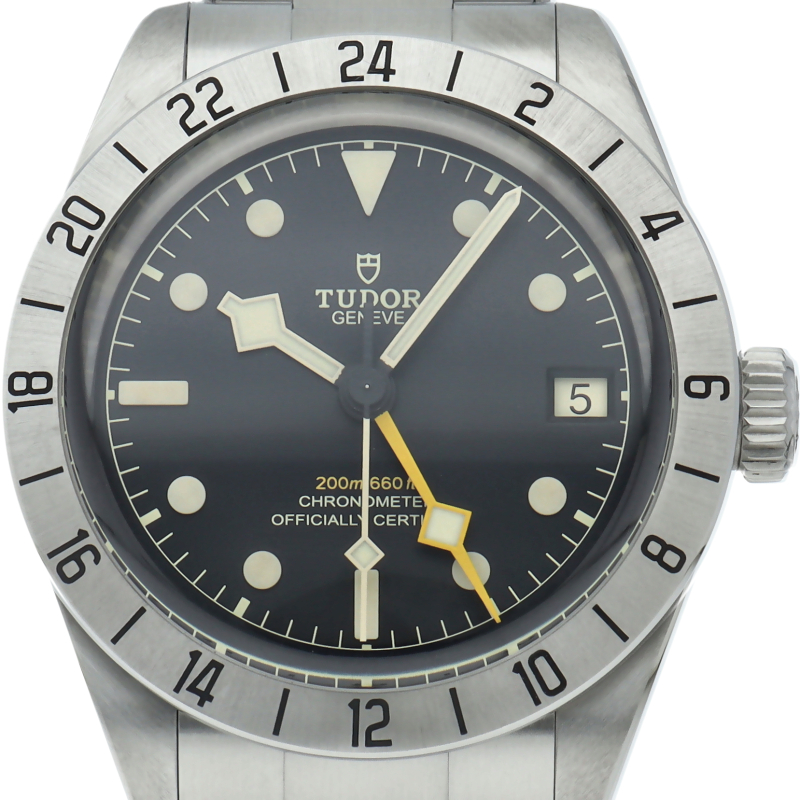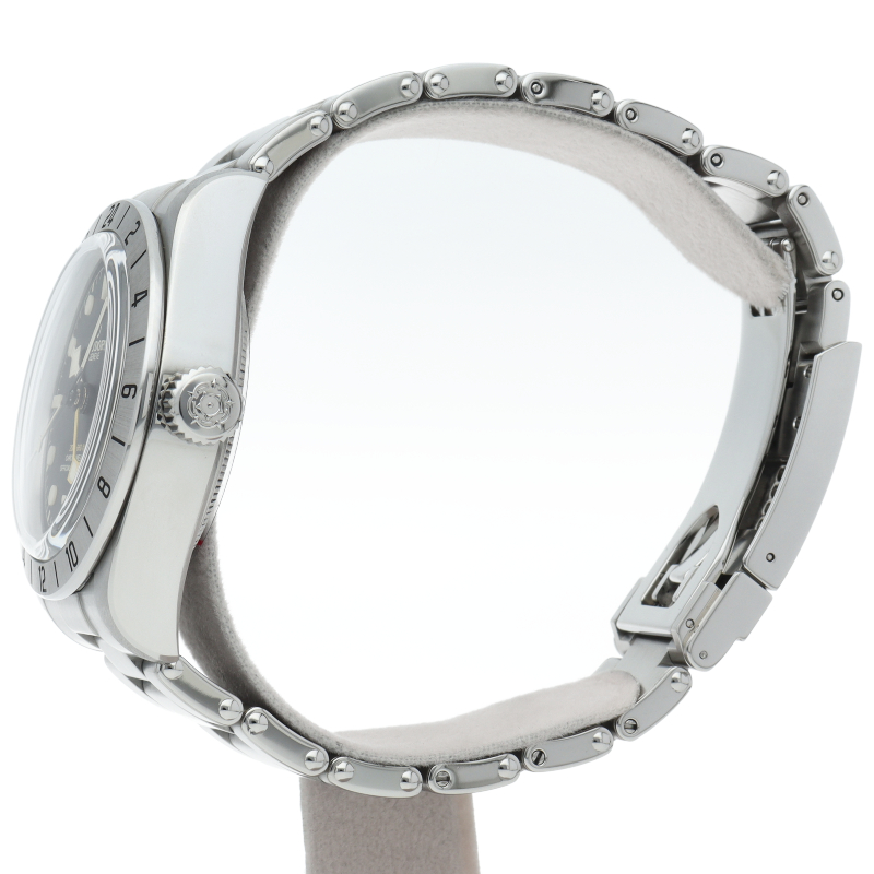 固定式のベゼルに刻印された24時間表示、大きめのイエローの24時間針等、ロレックスの初代エクスプローラー2を彷彿とさせるデザインで話題を呼んだブラックベイプロ。人気機種のフィフティーエイトと同じ39ミリケースを採用しており、日本人の手首周りにも馴染みやすいKサイズ感です。ムーブメントはクロノメーター認定を受け70時間のパワーリザーブを有する、両方向巻上げ式の自社製MT5652を搭載しています。