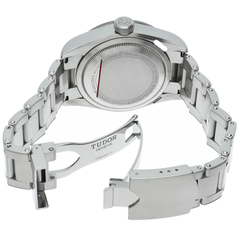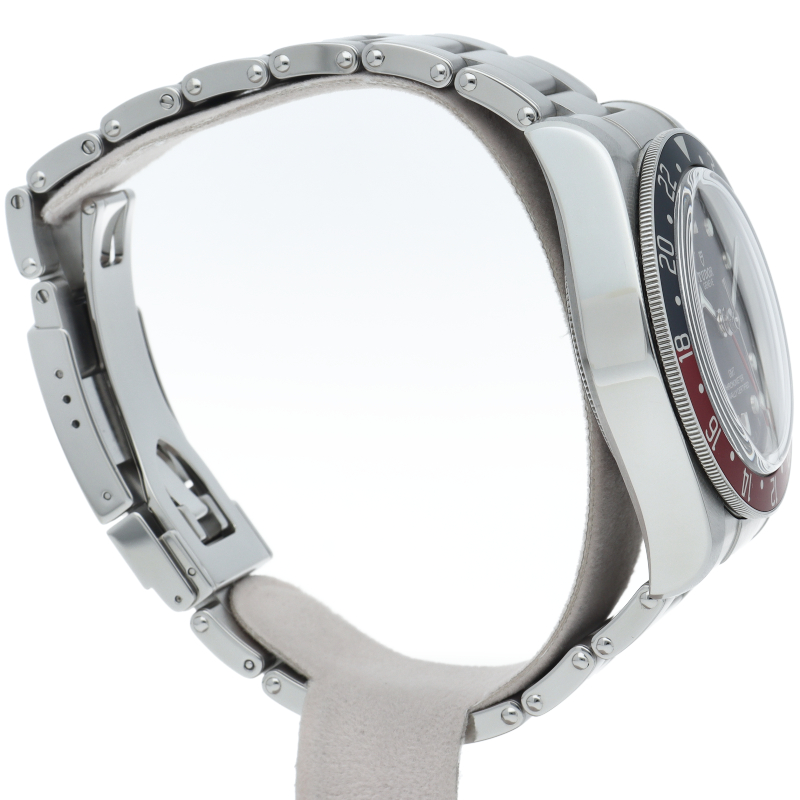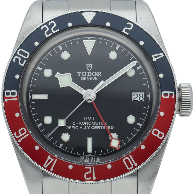 チュードルを代表するスポーツモデル「ブラックベイ」のGMT搭載モデル。ベゼルは昼夜がわかる様「ブルー/レッド」の2トーンの通称ペプシカラーとなっています。過去のダイバーズウォッチからインスピレーションを得た四角い針はGMT針にも付いています。自社製GMTムーブメント「MT5652」を搭載。70時間のパワーリザーブを誇り、クロノメーター認定を受けたムーブメントです。