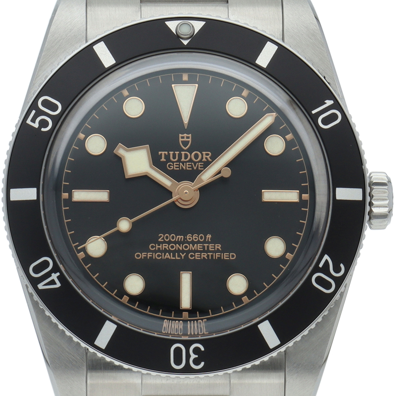 チューダーの初期のサブマリーナに使用されていた通称“イカ針”を採用した「ブラックベイ」。こちらはステンレスタイプでケース径37mmモデル。1960年代までのロレックスやチューダーに使われていたリベットブレス仕様のダイバーウォッチです。