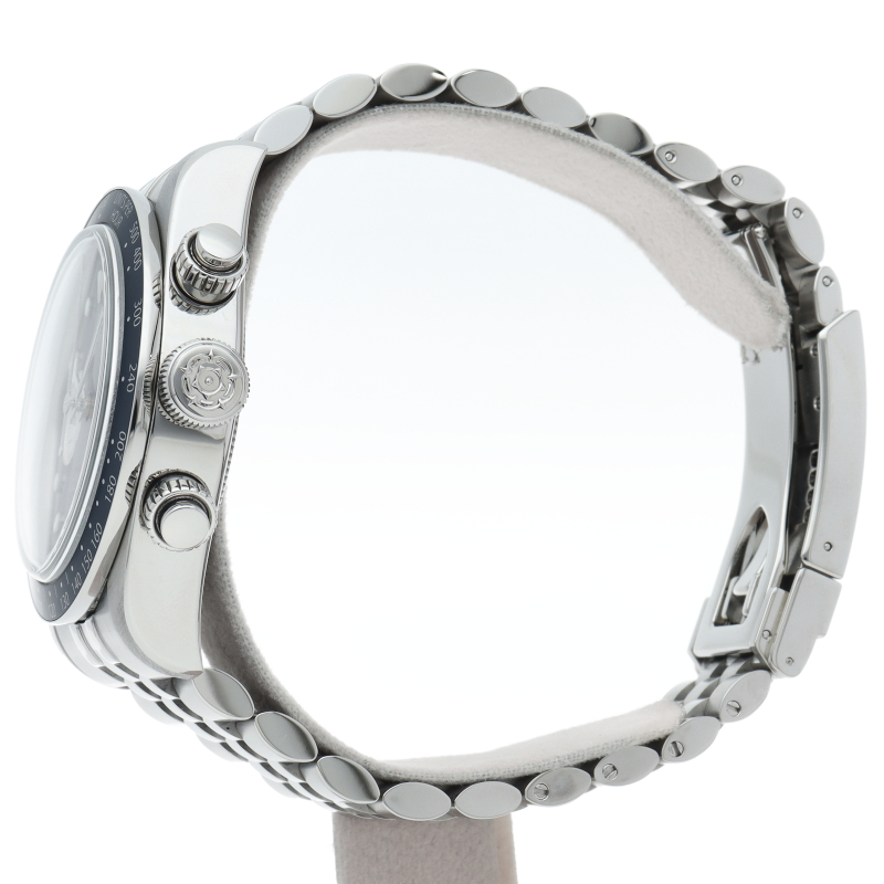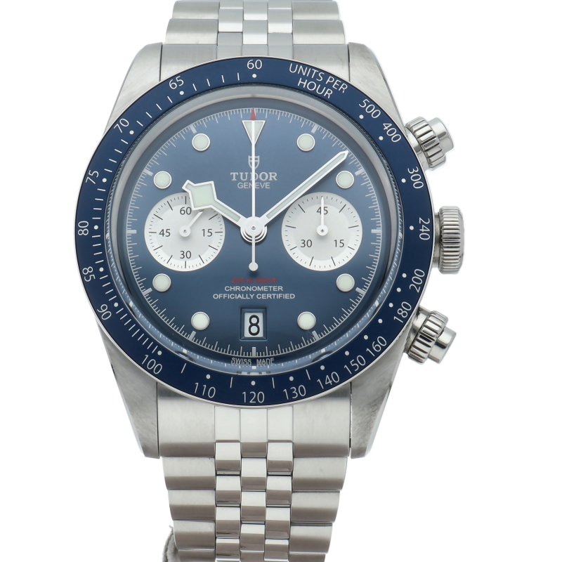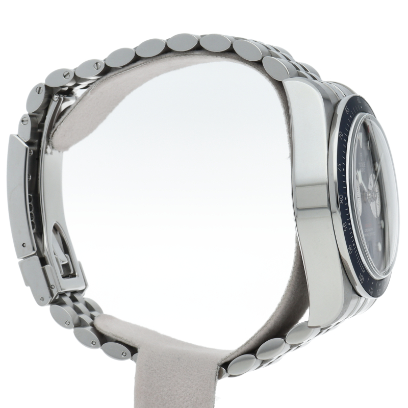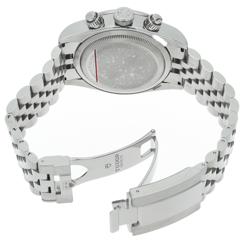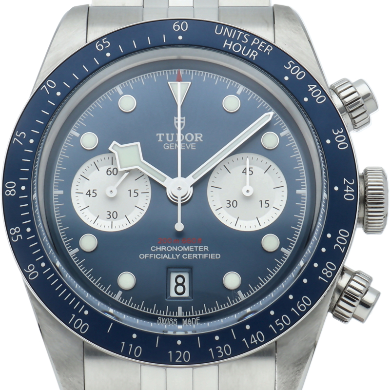 チューダーダイバーズウォッチのアイコンとなっている「スノーフレーク針」と初期のチューダークロノグラフから着想を得た、45分カウンターと6時位置のカレンダーはそのままに、鮮やかなブルーのダイヤルとベゼルを備えます。セルフアジャストが可能な“T-fit”クラスプを搭載し、簡単な操作で8mmの長さを5段階で調節可能になっており自分にぴったりなつけ心地に調整することができます。