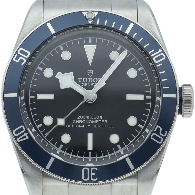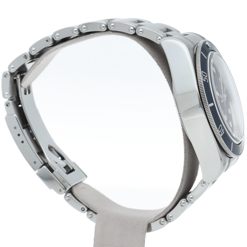 チューダーの初期のサブマリーナに使用されていた通称“イカ針”を採用した「ブラックベイ」2016年発表のニューモデルです。ダイヤルには現行タイプの「盾」マークがプリントされていますが、リューズトップにはヴィンテージ感の漂う「バラ」マークを刻印。ムーブメントにはCOSC公認のクロノメーターを取得した70時間パワーリザーブの自社製キャリバー「MT5602」を搭載。